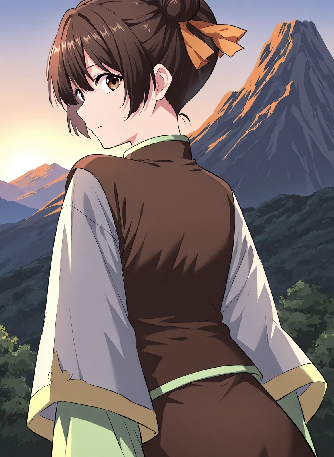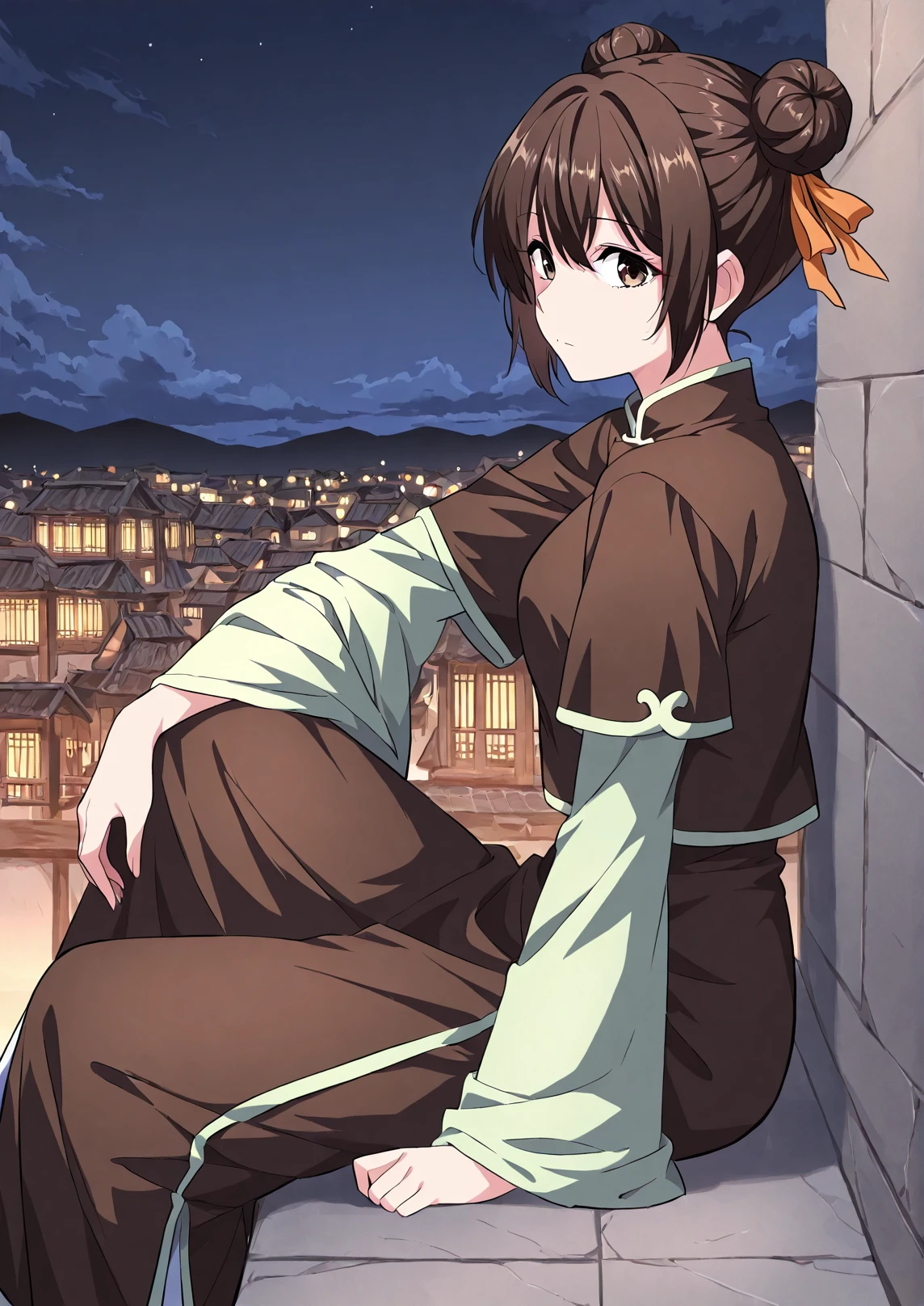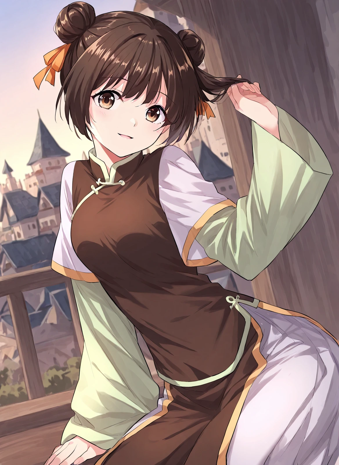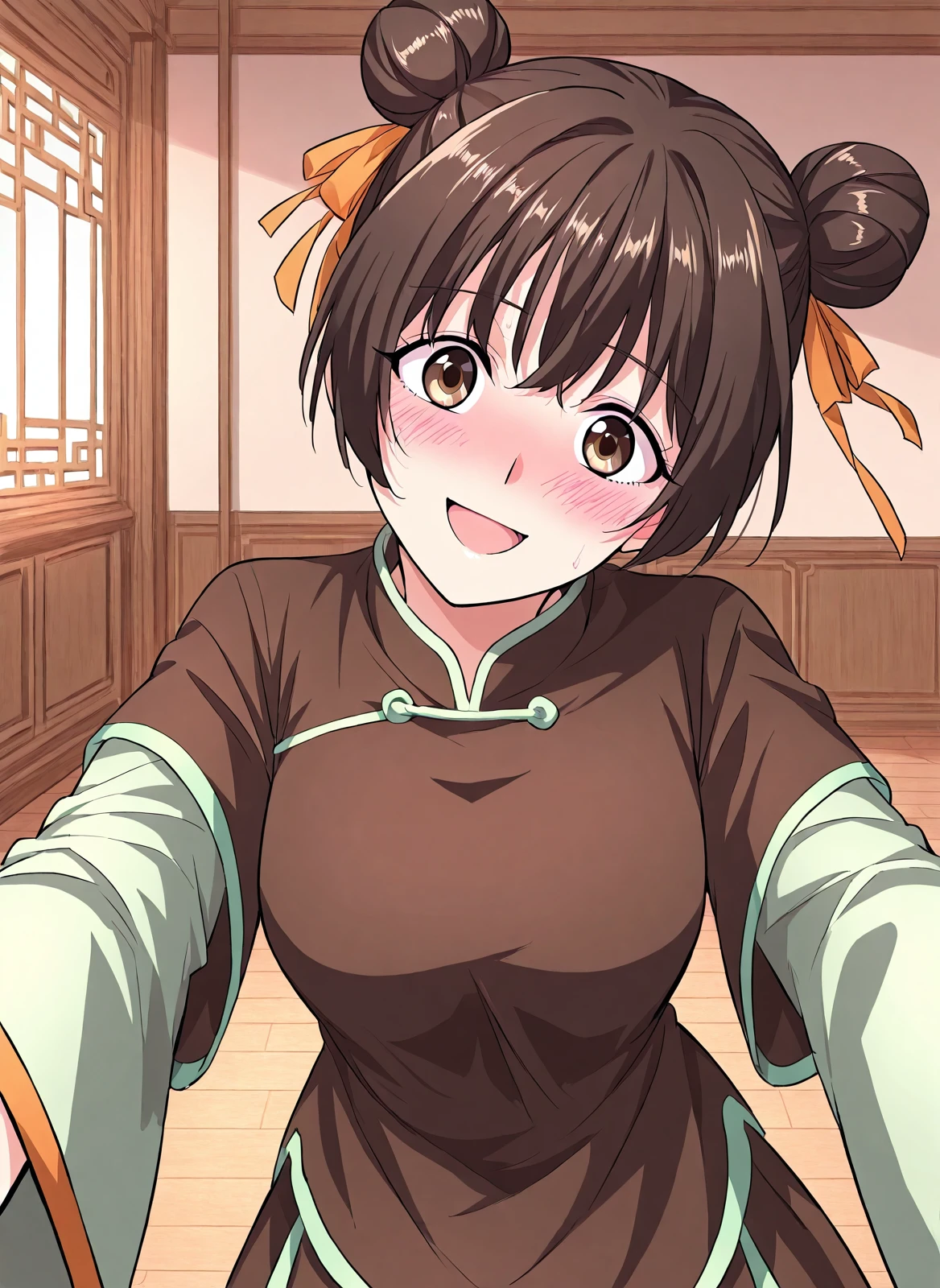 1 girl, solo, short dark brown hair, hair buns, double bun, orange ribbon on hair, big brown eyes,