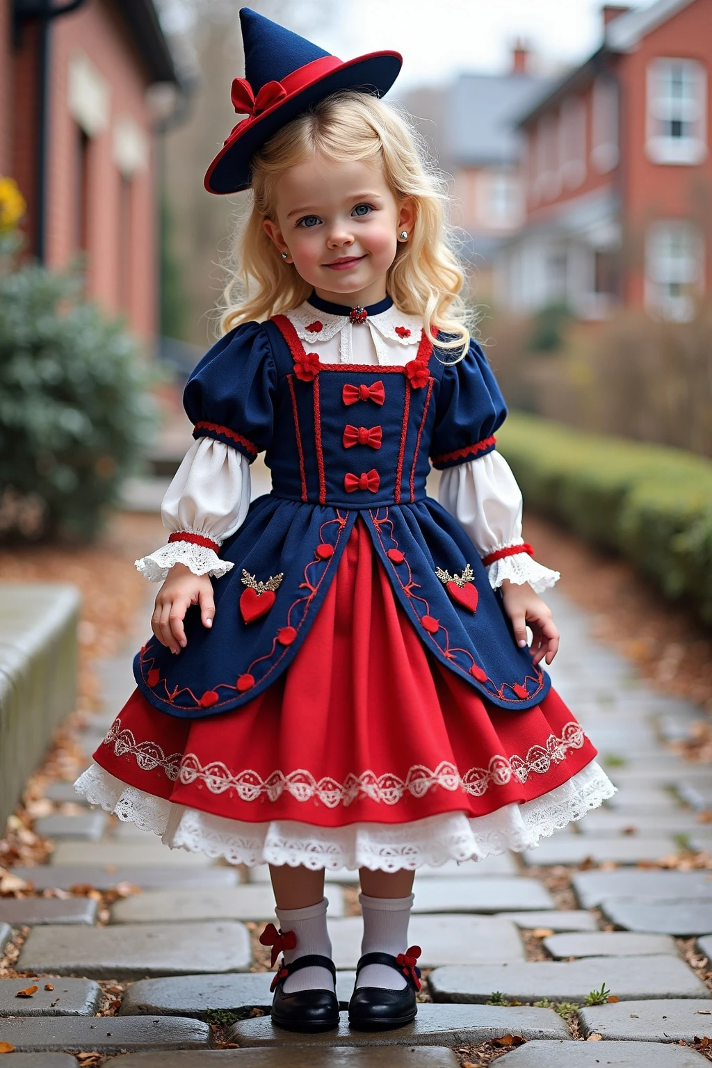 Navy blue, red and white color scheme, create cute fairy - tale - like dresses, add lace, ribbons, and small hats for a magical look.