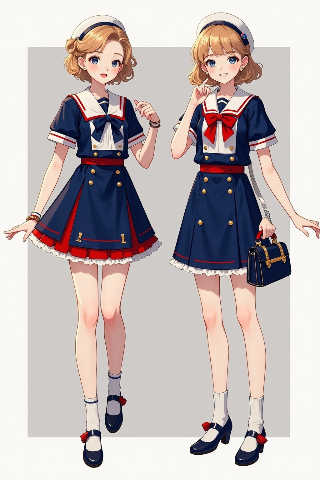 Navy blue, red and white color scheme, design retro - style sailor suits, with sailor collars, pleated skirts, and little bags as accents.