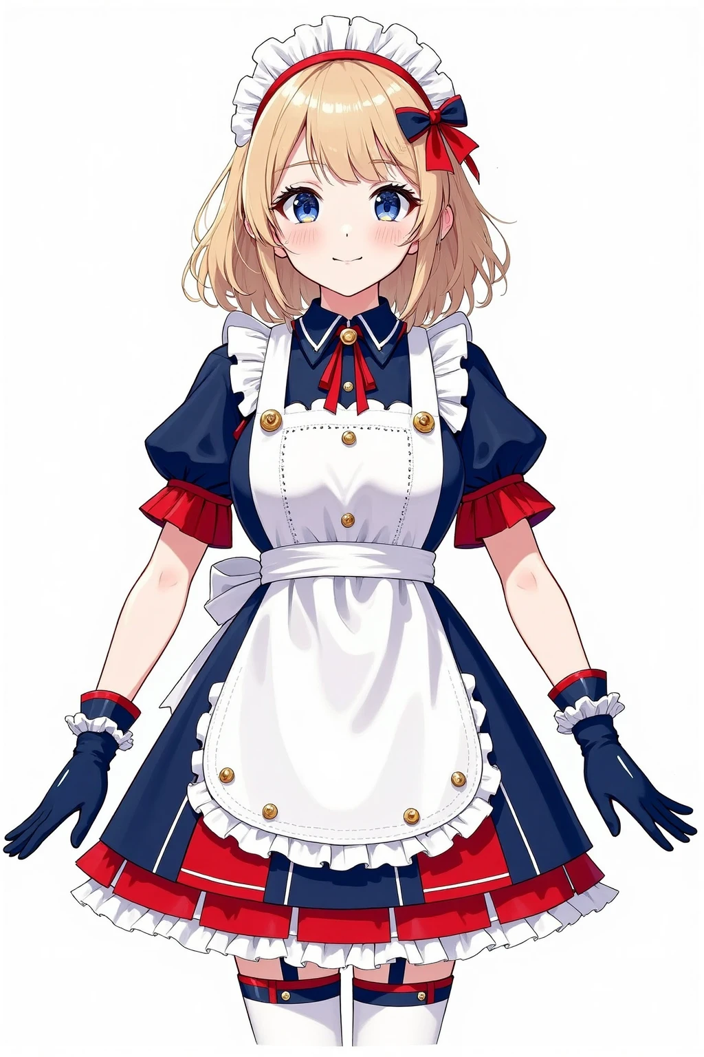 Navy blue, red and white color scheme, draw fantasy maid costumes, include aprons, gloves, and headpieces, making them look elegant.