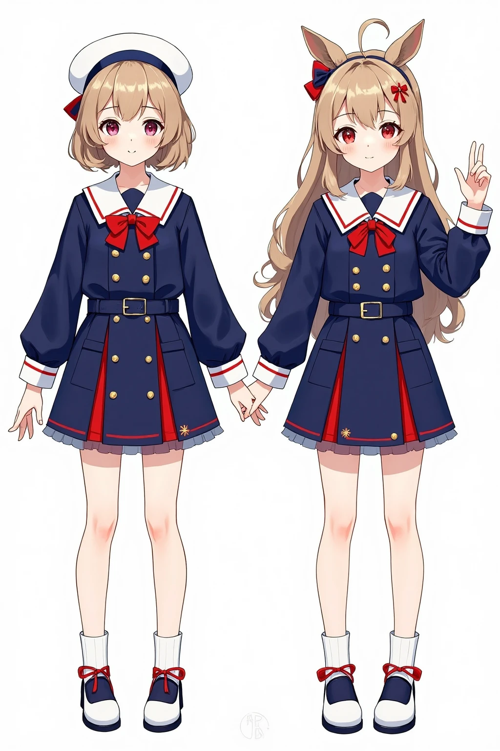 Navy blue, red and white color scheme, create anime - style school uniforms, add details like belts, collars, and matching shoes for a uniform set.