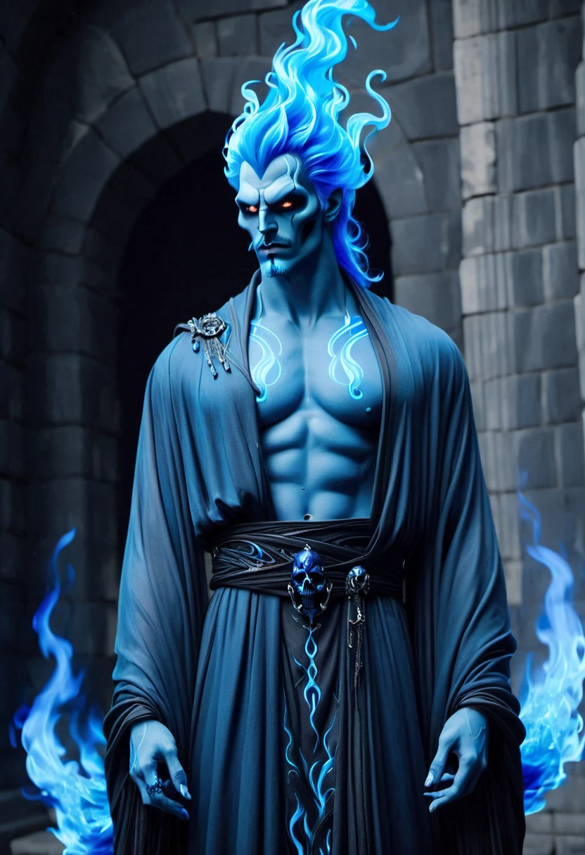 "(((masterpiece))) , (((best quality))) , anime style, 2d, well-built charming 1boy, solo, lovely 1boy, Hades-ish, beautiful gorgeous Jonathan Frakes, (blue flames instead of hair), long flowing elegant skull motif robe, (stone dungeon background:1.2), he has Shaved sides hair, key visual, he has Shaved sides hair, key visual"