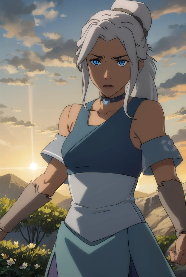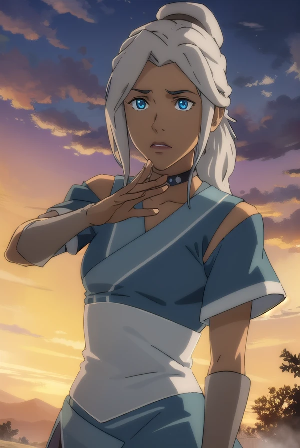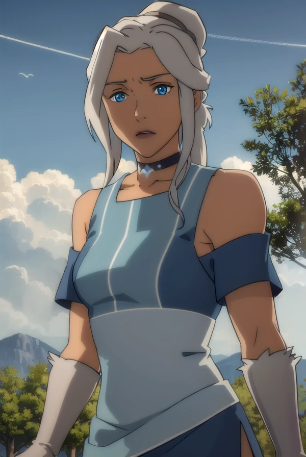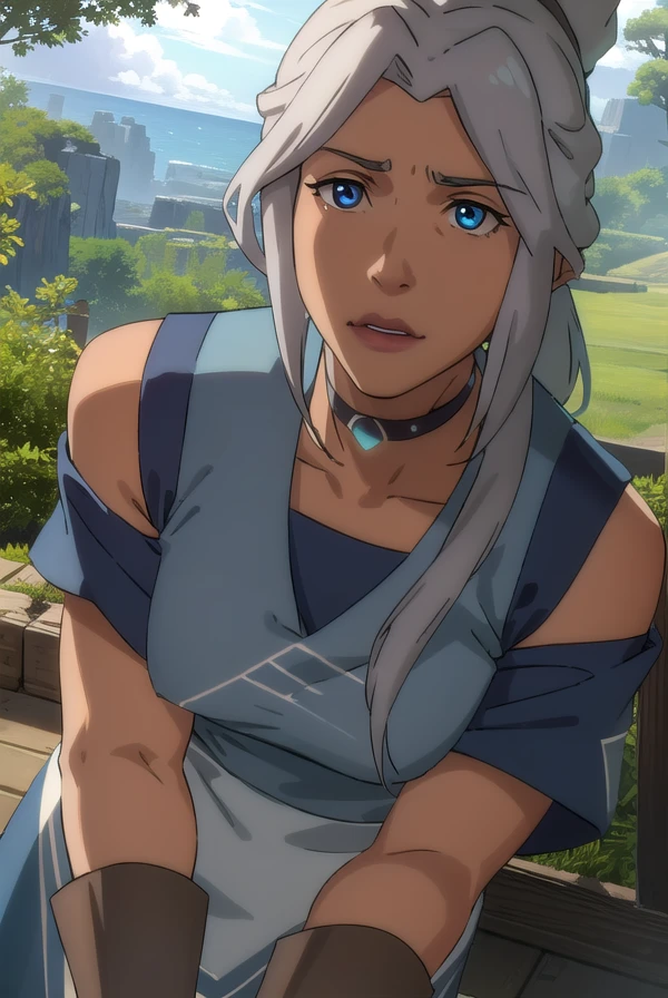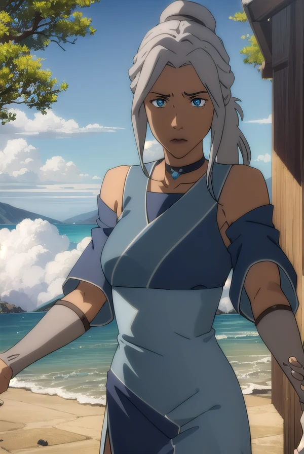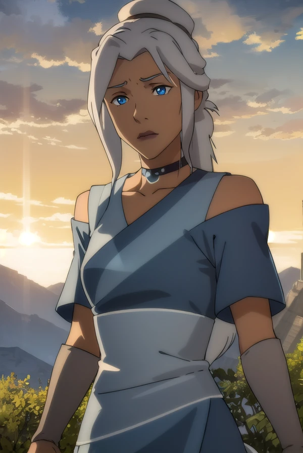 kya, long hair, ponytail, grey hair, hair bun, single hair bun, blue eyes, dark skin, dark-skinned female,