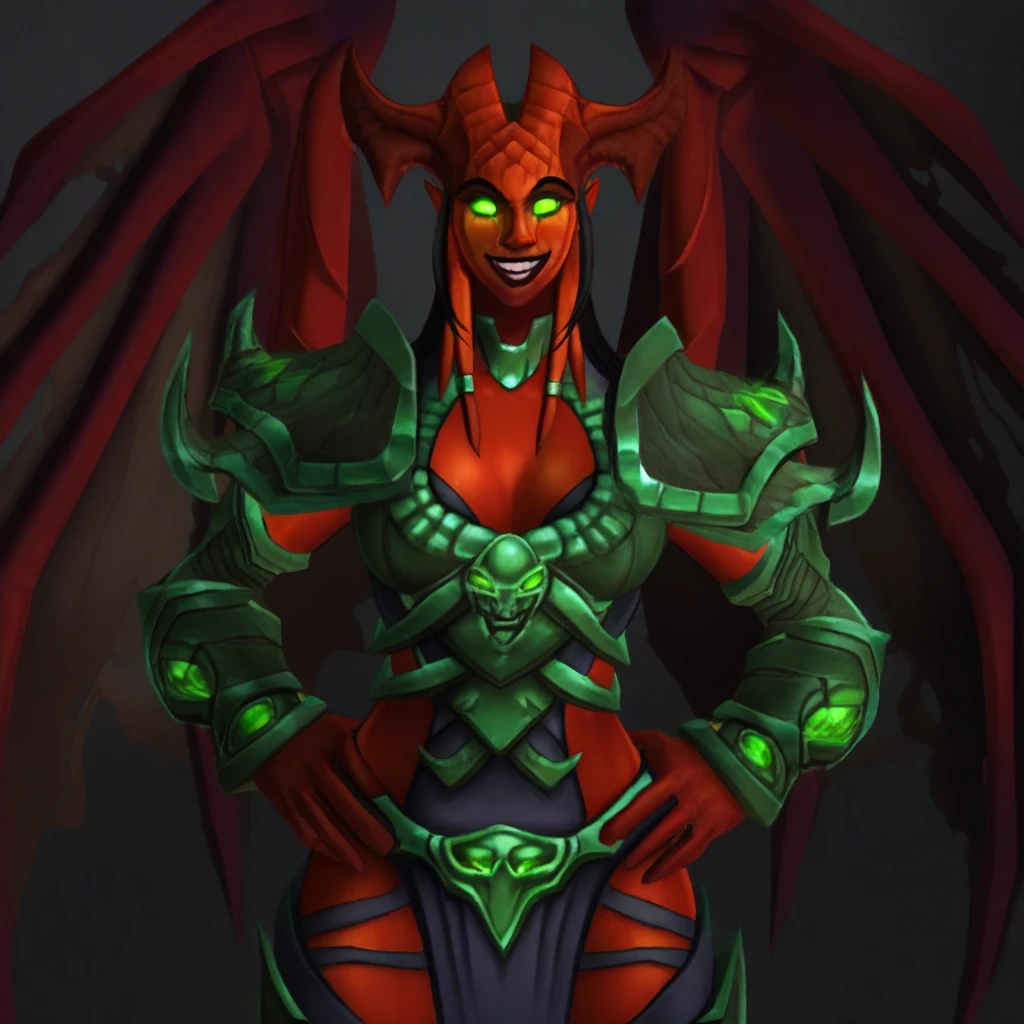 1girl, eredar, wings, colored skin, glowing eyes, green eyes, horns, tail,