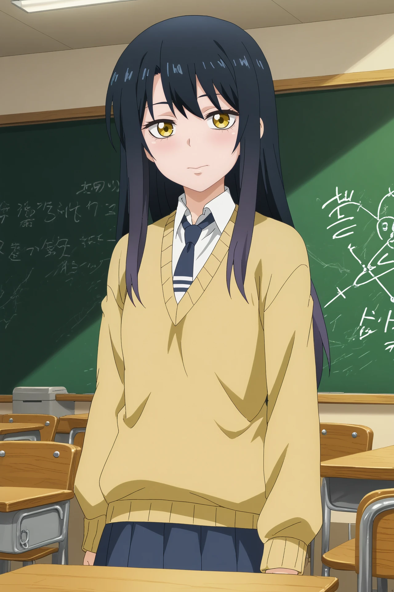School uniform : mieruko,1girl,solo,long hair,necktie,skirt,school uniform,sweater,pleated skirt,blue necktie,blue skirt