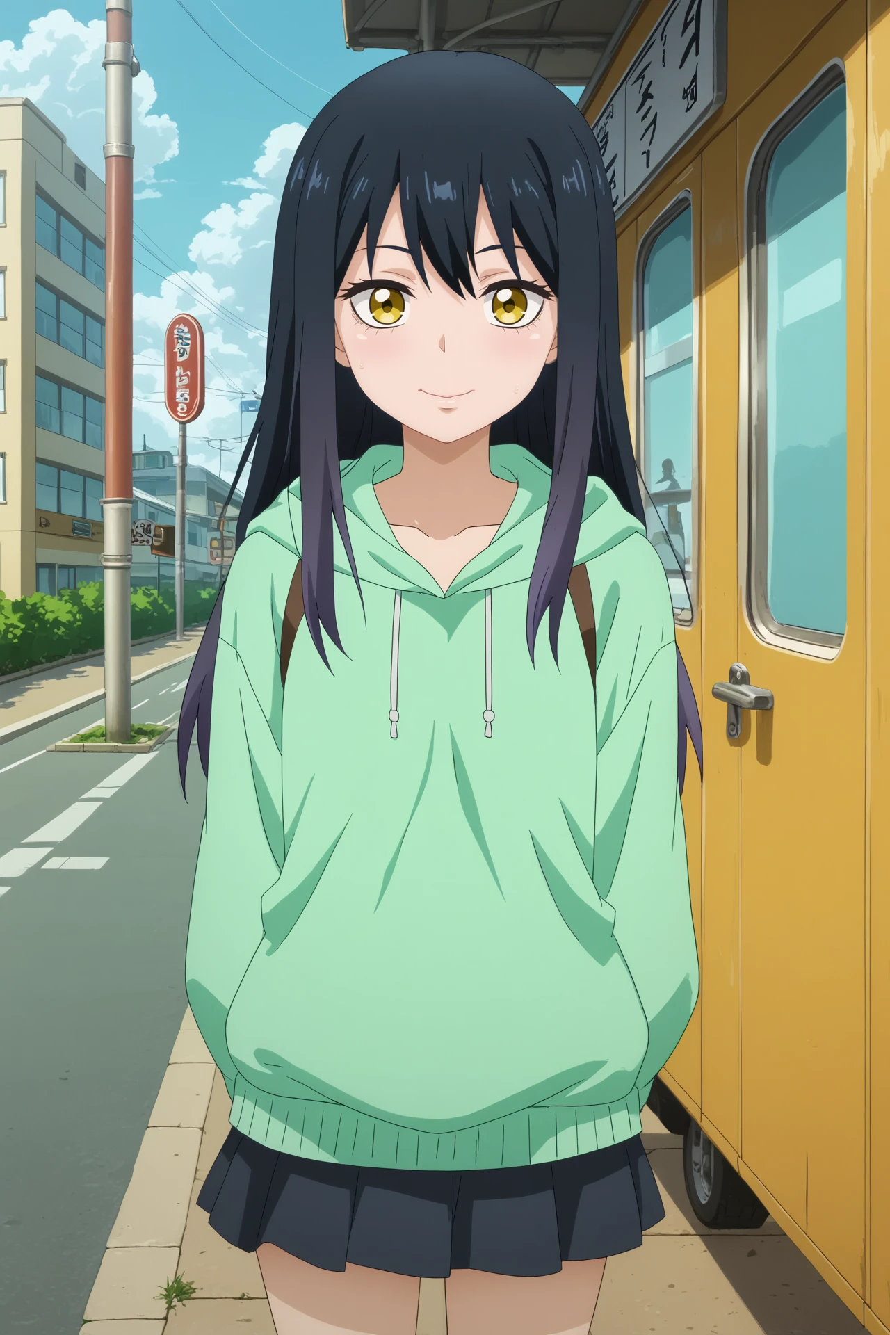 Green Hoodie : mieruko,1girl,solo,long hair,hooded sweater,green hoodie,black skirt,mini skirt