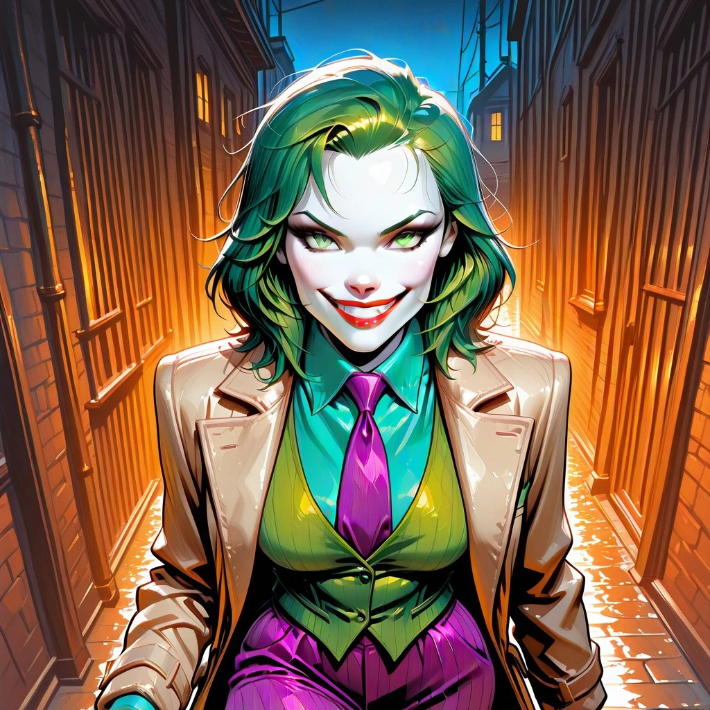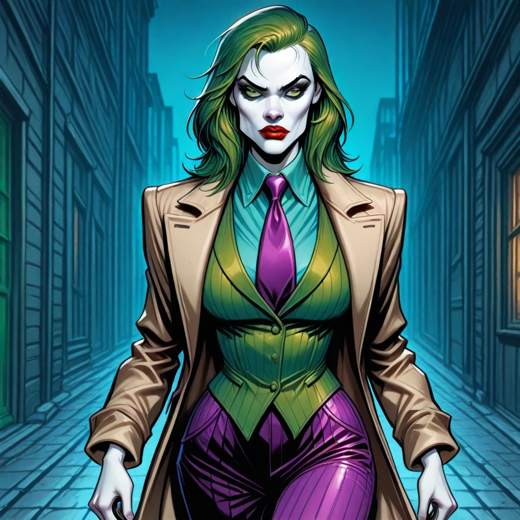 Faithful prompt: "jokerette, jokertrench suit, necktie, 1girl, medium hair, green hair, colored skin, white skin, suit, green eyes, tan trenchcoat, green vest, aqua shirt, purple tie, purple pants, pinstripes"