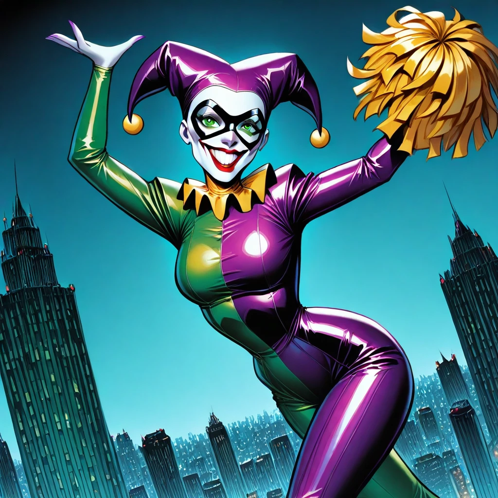 Faithful(ish) prompt: "jokerette, jokerbatgirl suit, 1girl,green hair, colored skin, white skin, two tone , purple , green , cape, green eyes, short hair, pixie cut, teeth, superhero" (you can do "hood back" to have her face fully visible, or add "cowl" and "mask" to cover her upper face and give her the bat-family's distinct profile)