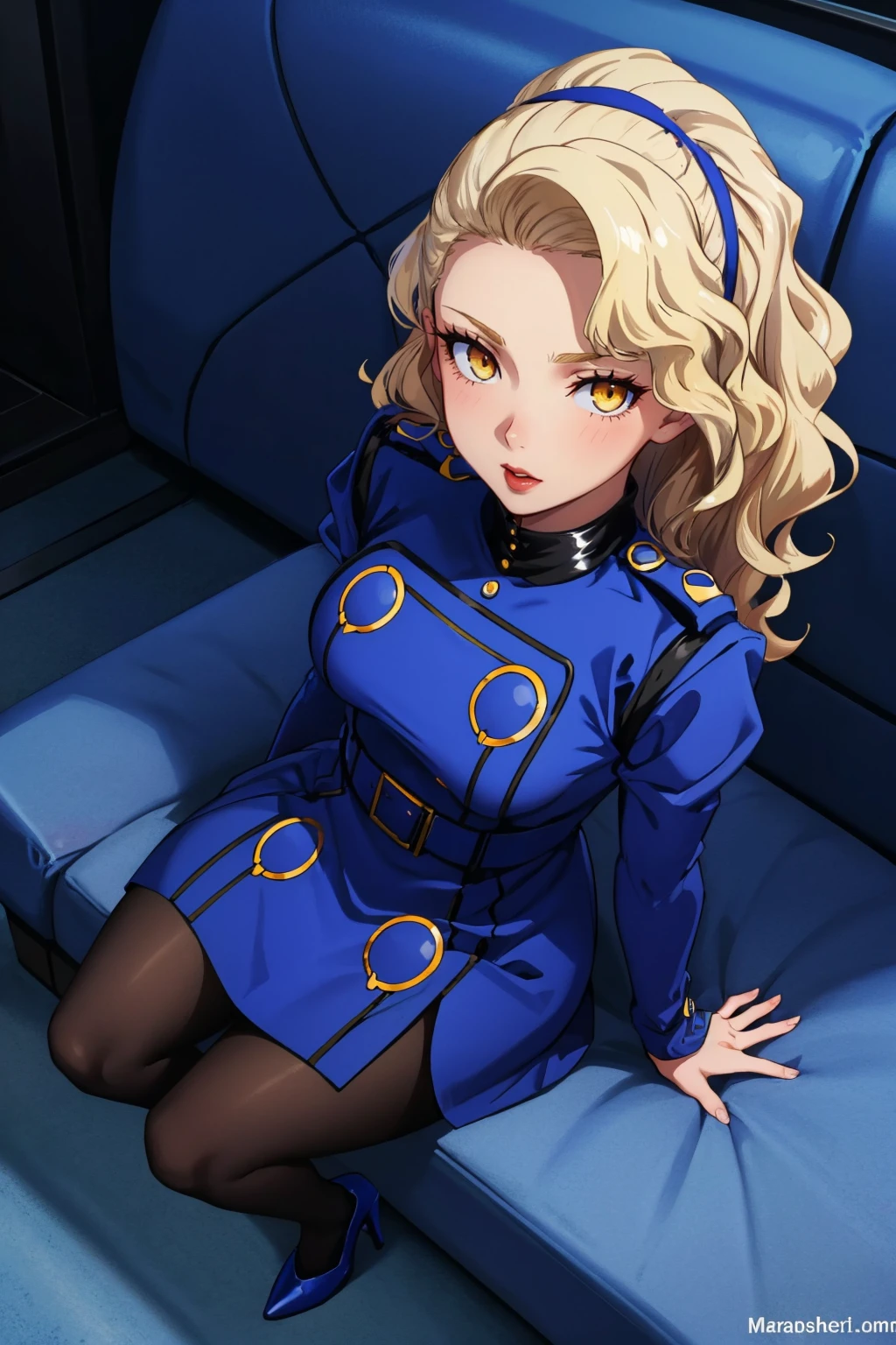 Tags: margaretp4, blonde hair, long hair, yellow eyes, headband, dress, long sleeves, black pantyhose, high heels, lipstick