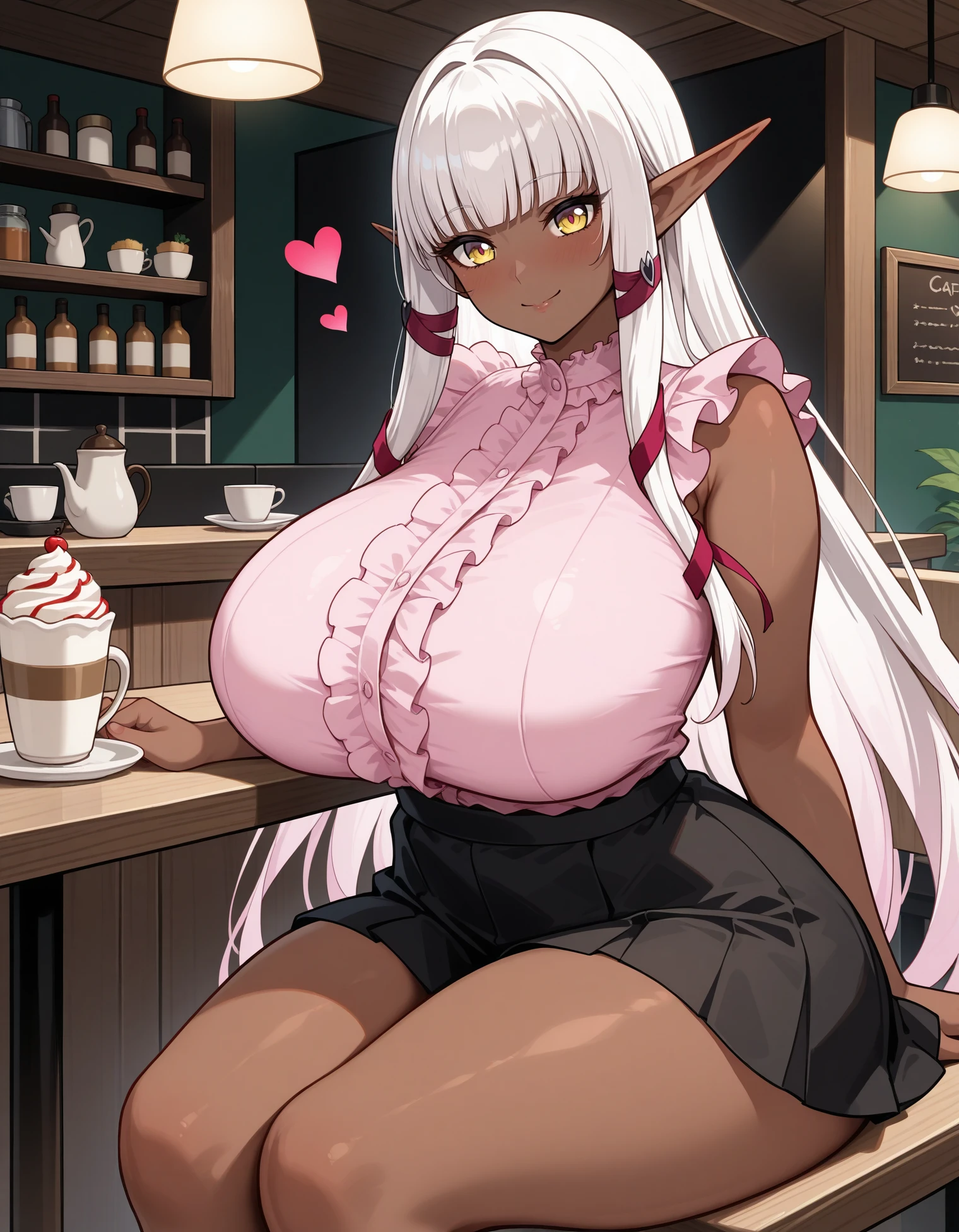 " evelycede , huge breasts, dark elf, dark-skinned female, pointy ears, yellow eyes, sidelocks, white hair, blunt bangs, tress ribbon, hair ribbon, red ribbon"
