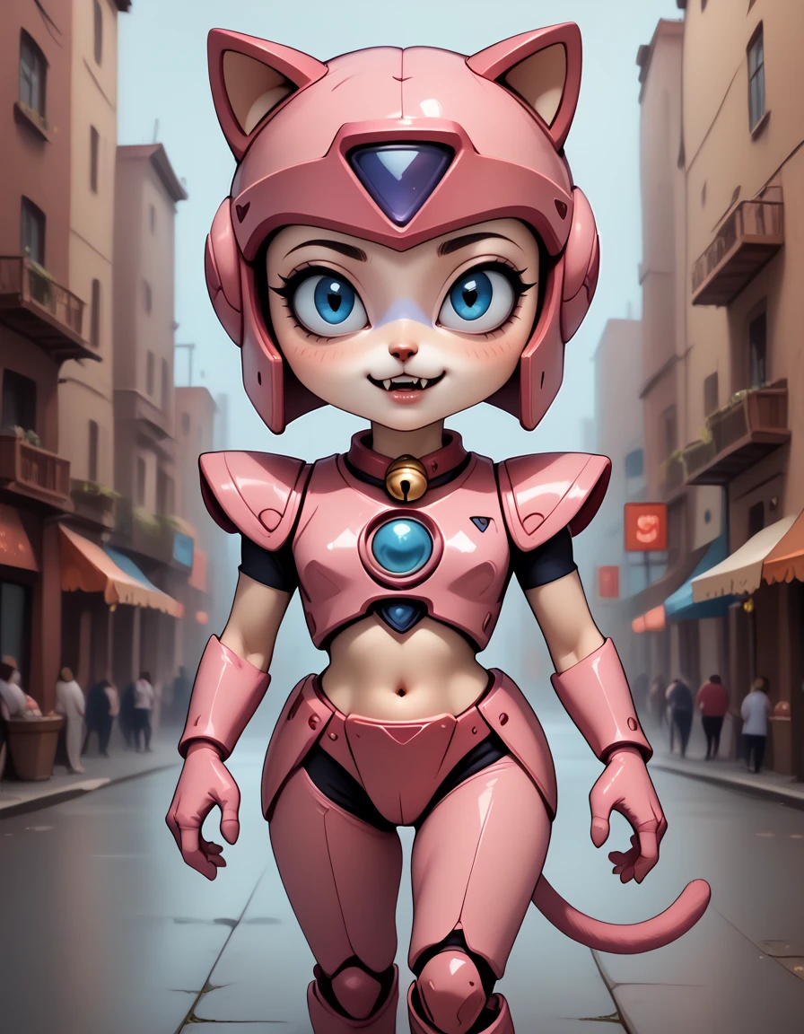pink helmet, fangs, cat ears, tan fur, white belly, cat girl, tail, neck bell, pink armor suit, whiskers,