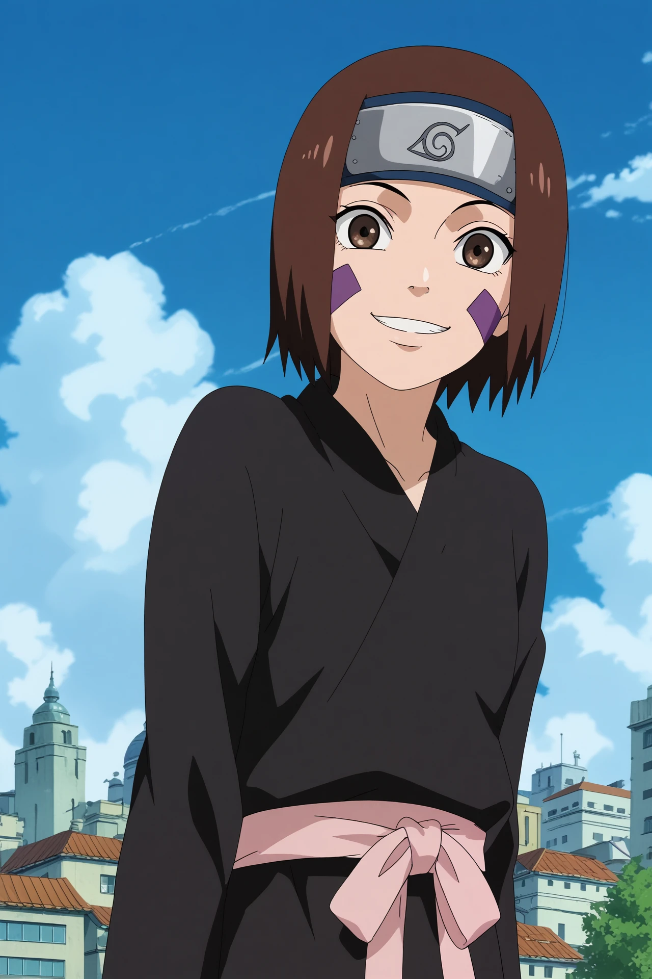 rin nohara,1girl,solo,konohagakure symbol,forehead protector,looking_at_viewer, facial mark,short hair,headband,ninjan,black shirt, long sleeves,japanese clothes