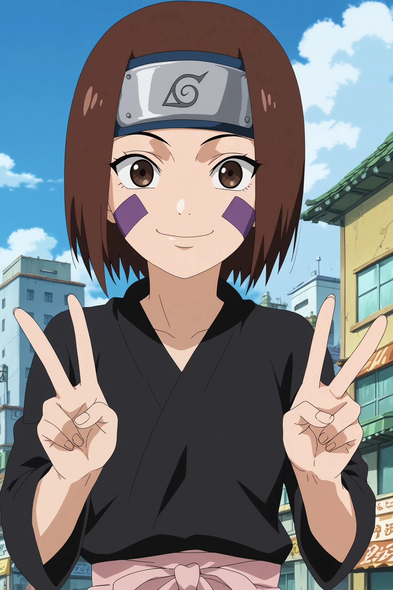 Triggers : rin nohara,1girl,solo,konohagakure symbol,forehead protector,looking_at_viewer, facial mark,short hair,headband,ninjan,black shirt, long sleeves,japanese clothes
