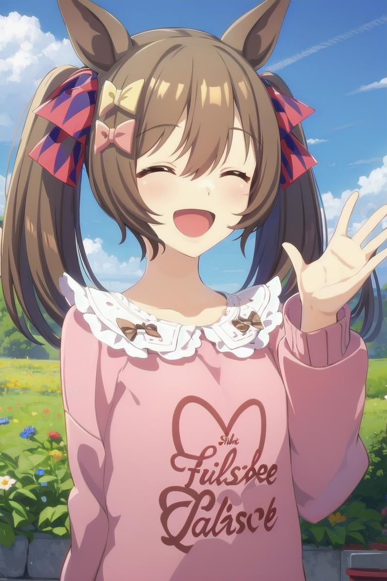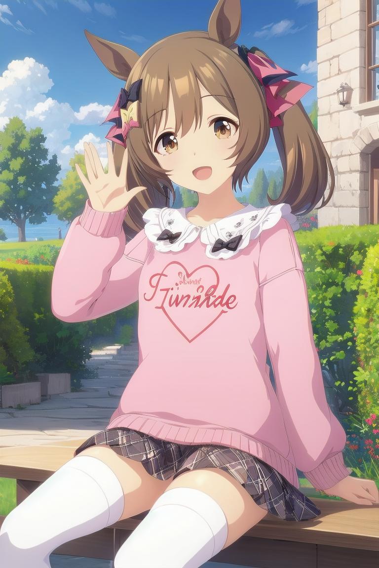 brown hair, horse ears, twintails, (hair bow), hair ribbon, brown eyes, epink sweater, frilled collar, (clothes writing), long sleeves, pleated skirt, white thighhighs, pink footwearSmart Falcon (umamusume) (casual clothes ver.) Lora