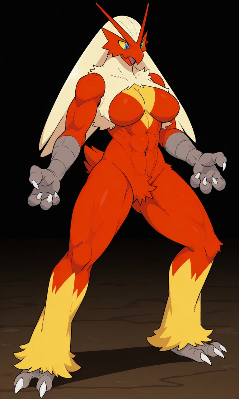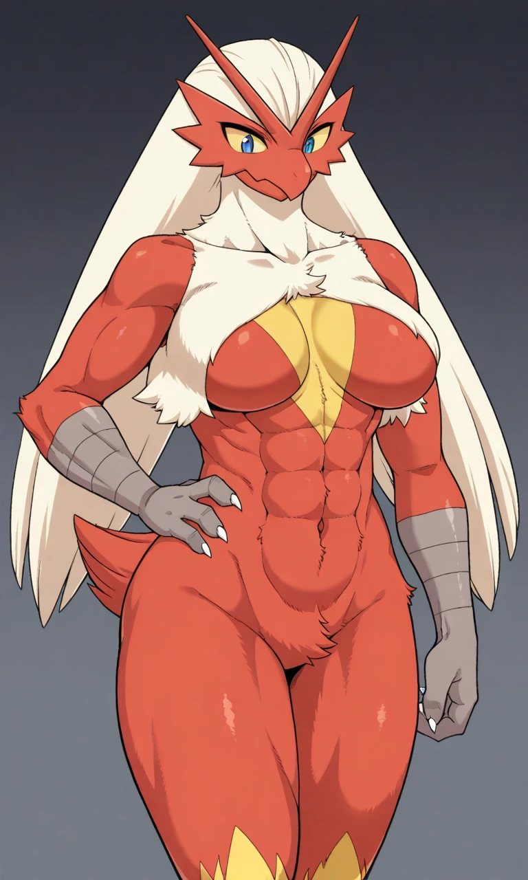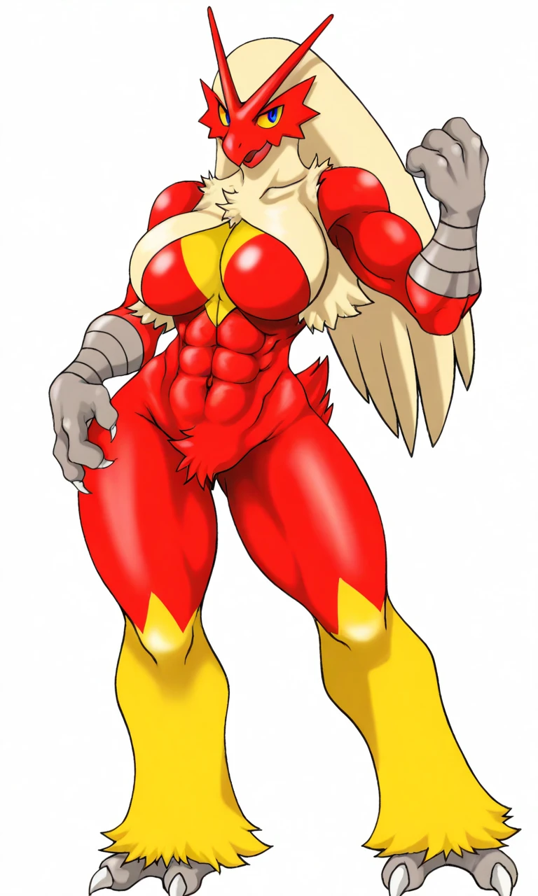 blaziken, 1girl, abs, beak, bird girl, bird tail, blonde hair, blue eyes, body fur, breasts, claws, furry female, long hair, navel, neck fur, no pussy, nude, red fur, scuted arms, thick thighs, toned female, two-tone fur, yellow fur, yellow sclera, muscular female