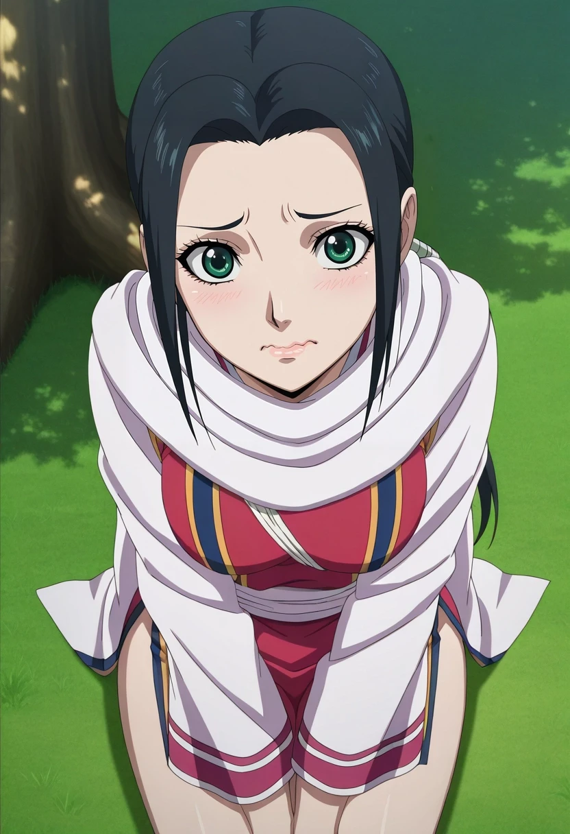 qiang_lei, black hair, green eyes, long hair, low ponytail