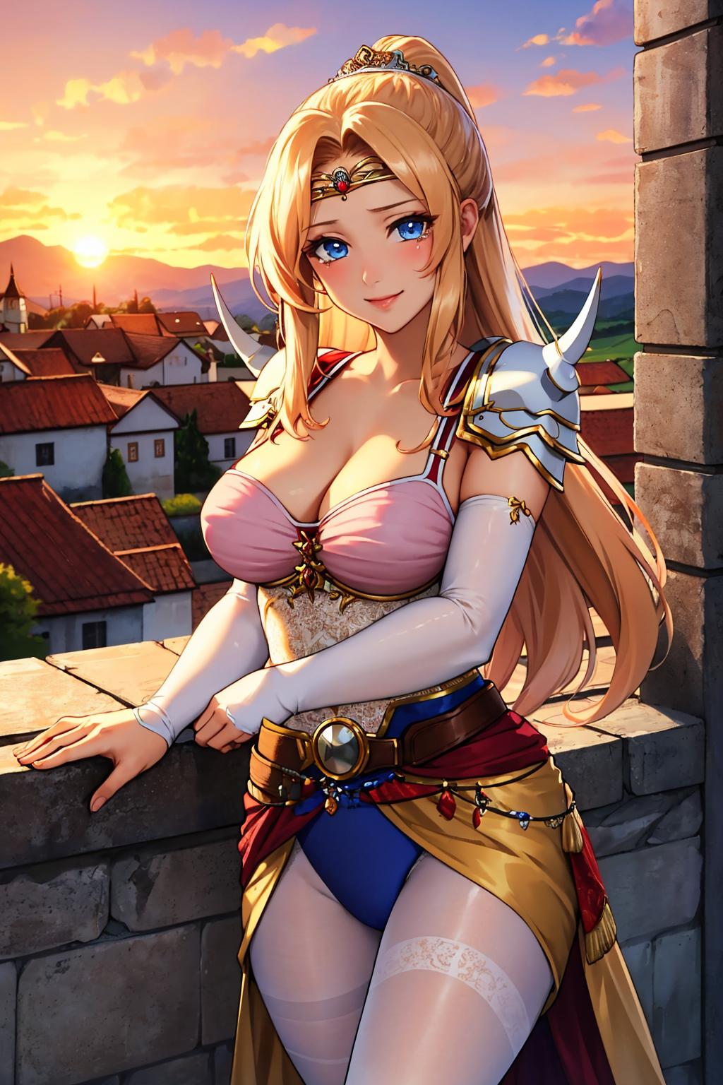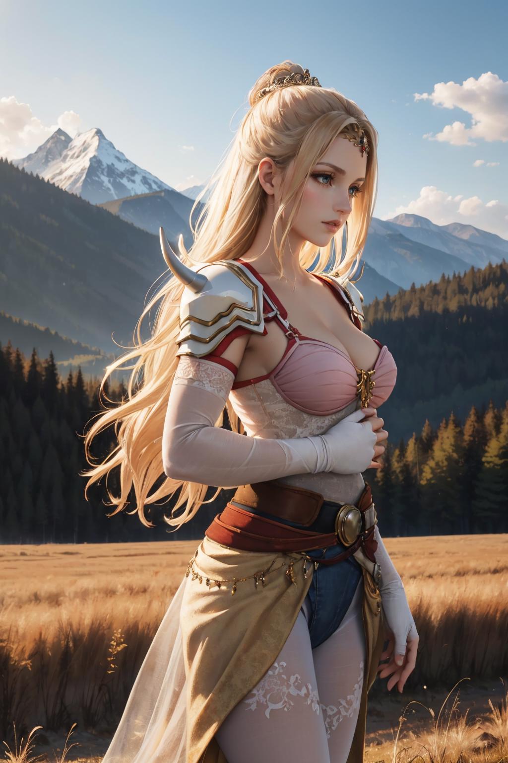 Add "shoulder armor, circlet, cleavage, cape, camisole, clothes around waist, white pantyhose" for her typical look.
