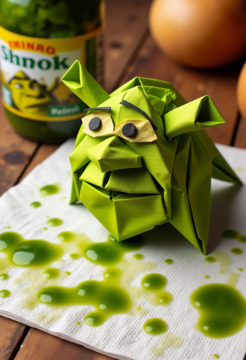 Photograph featuring an origami (SUBJECT) made from a single paper napkin, intricately folded with a white base color