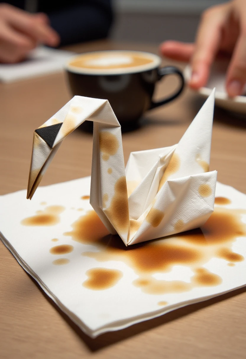 Photograph featuring an origami (SUBJECT) made from a single paper napkin, intricately folded with a white base color ...