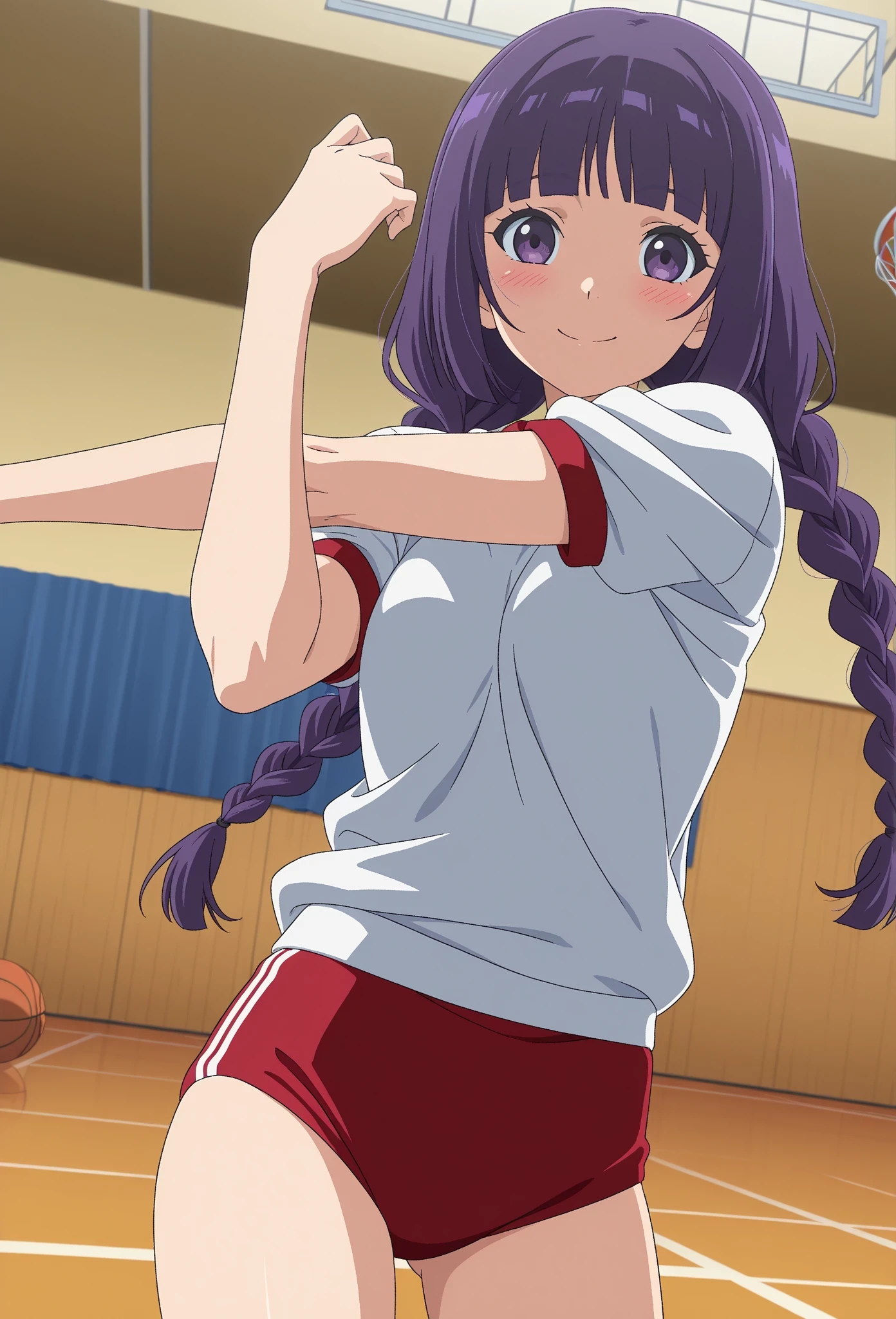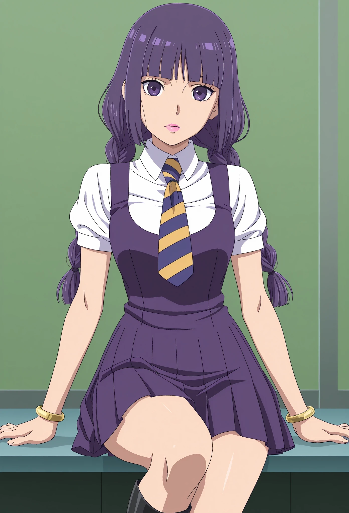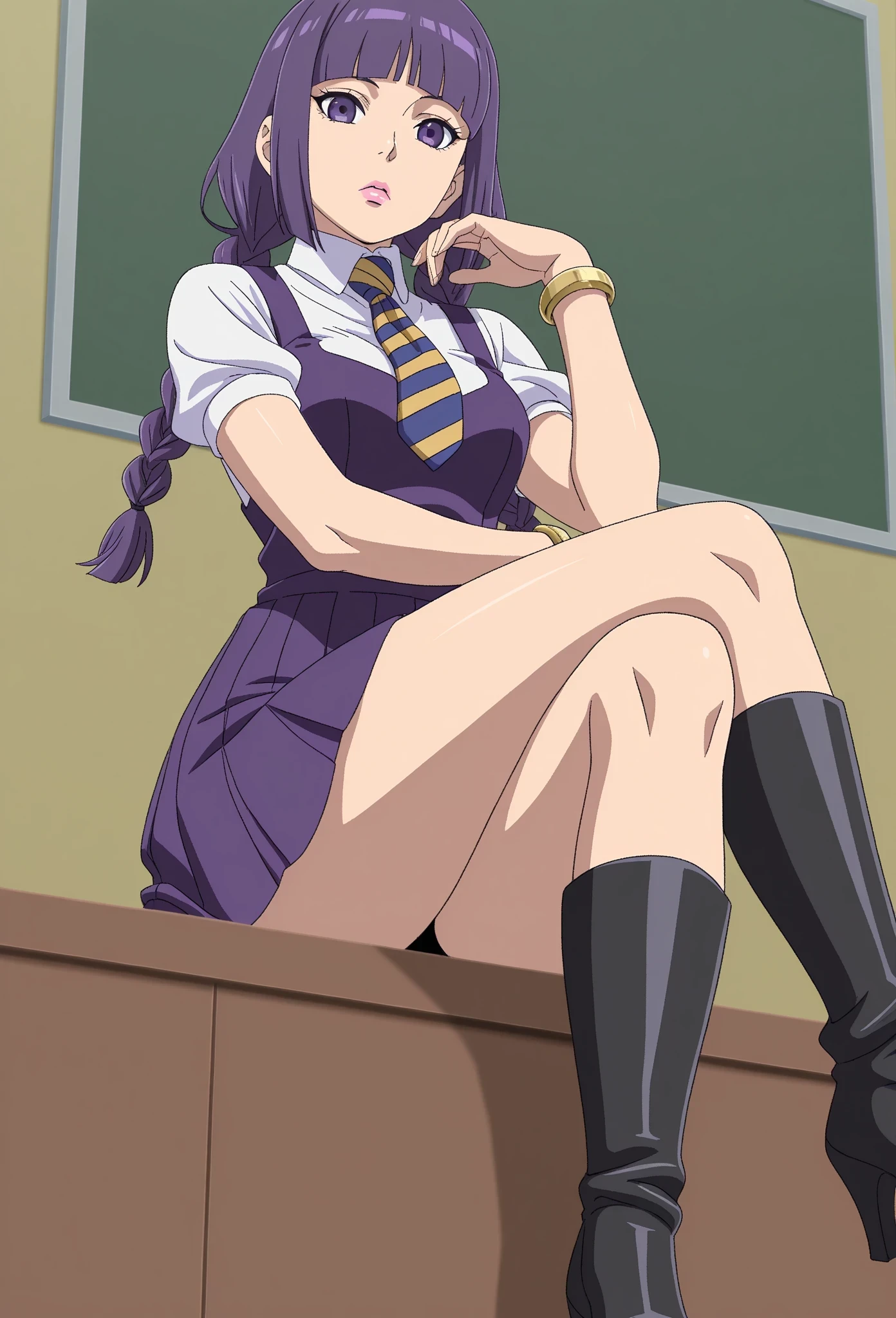 sumiretbv, 1girl, solo, purple hair, long braided hair, twin braids, blunt bangs, purple eyes, pink lips, school uniform, white shirt, striped tie, purple dress, pleated skirt, black high heels, knee high boots, gold bracelet, anime screencap, anime coloring