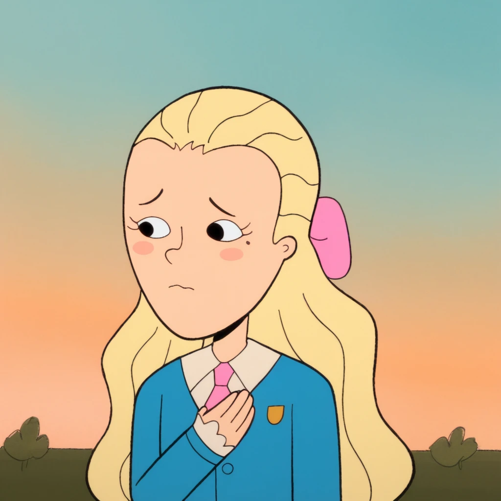 bethhs, collar, blonde hair, long hair, 1girl, necktie, solo, mole under eye, hair bow, blush stickers, school uniform, pink bow, black eyes, badge, skirt, mary janes, white pantyhose