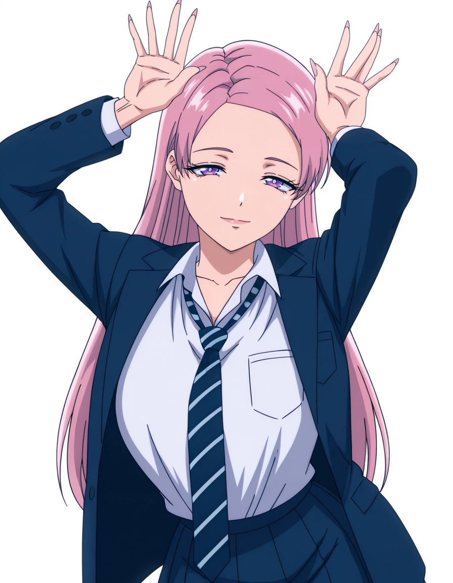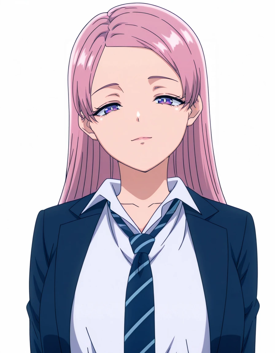 k4n0nm1y4sh1t4, 1girl, long hair, pink hair, purple eyes, collared shirt, white shirt, shirt, necktie, striped necktie, large breasts, shirt tucked in, blazer, blue blazer, skirt, blue skirt, pleated skirt