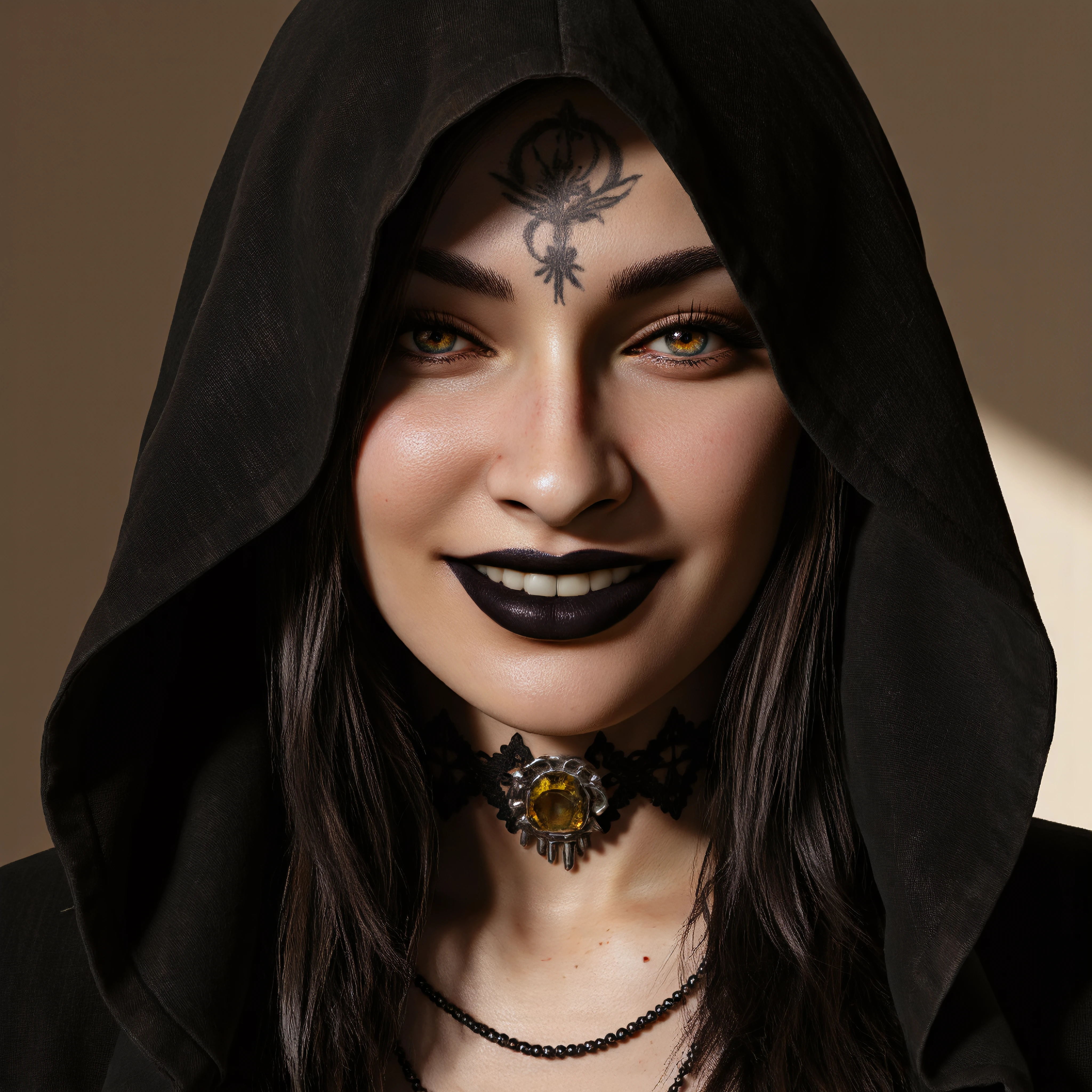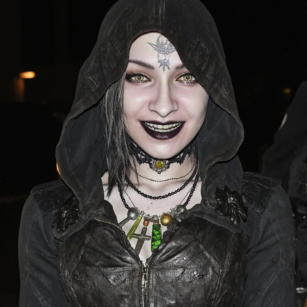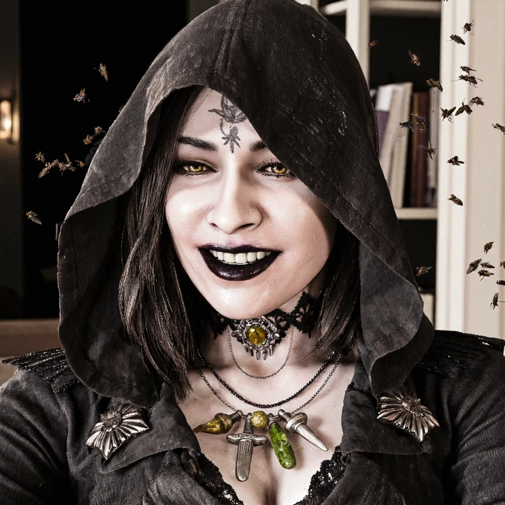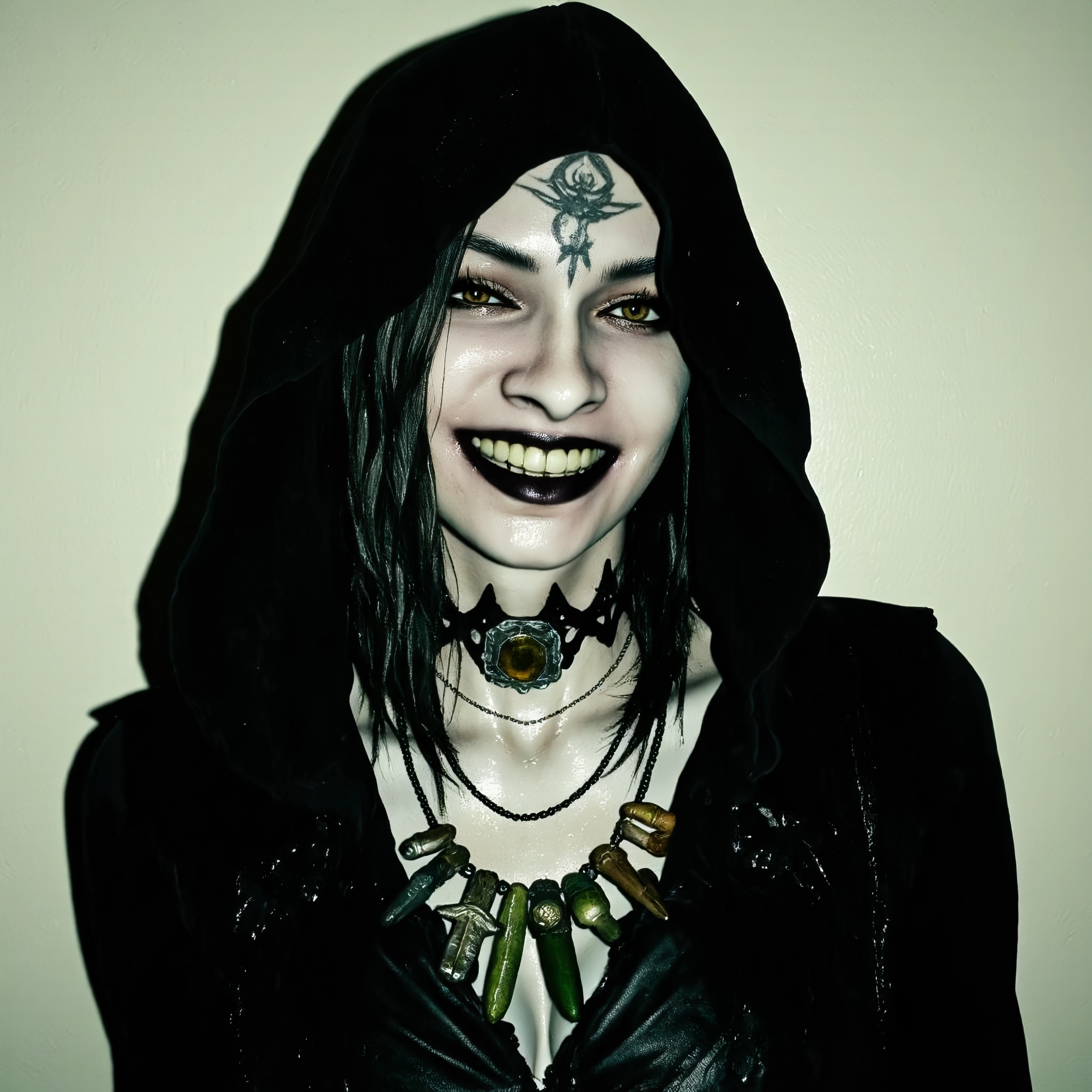 Cassandra Dimitrescu, she has pale grey skin, she has black hair, she has black lips, she has a tattoo on her forehead, she is wearing a choker with a yellow gem, she is wearing a necklace with trinkets, she is wearing a black Gothic dress, she is hooded, evil grin, she has blood on her mouth
