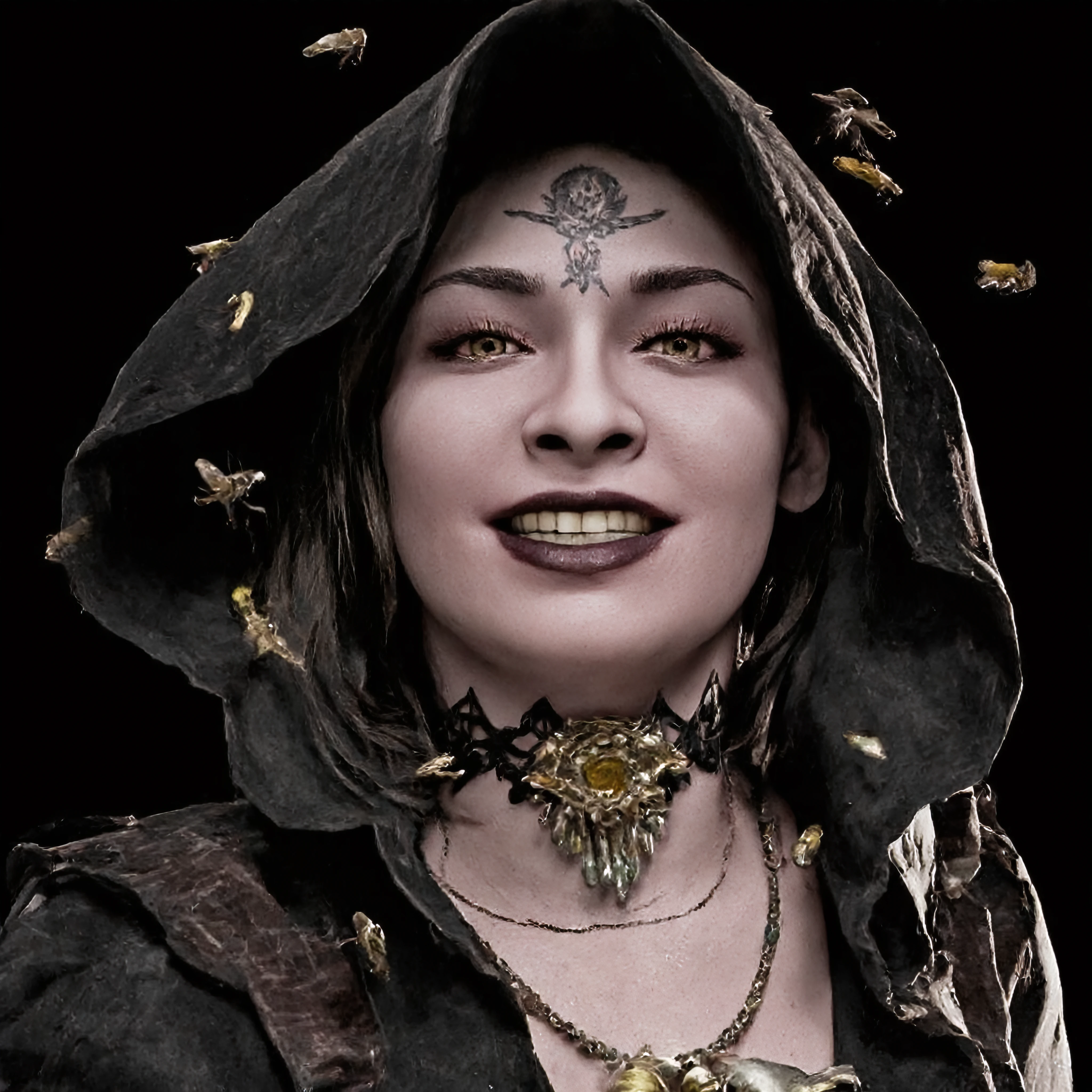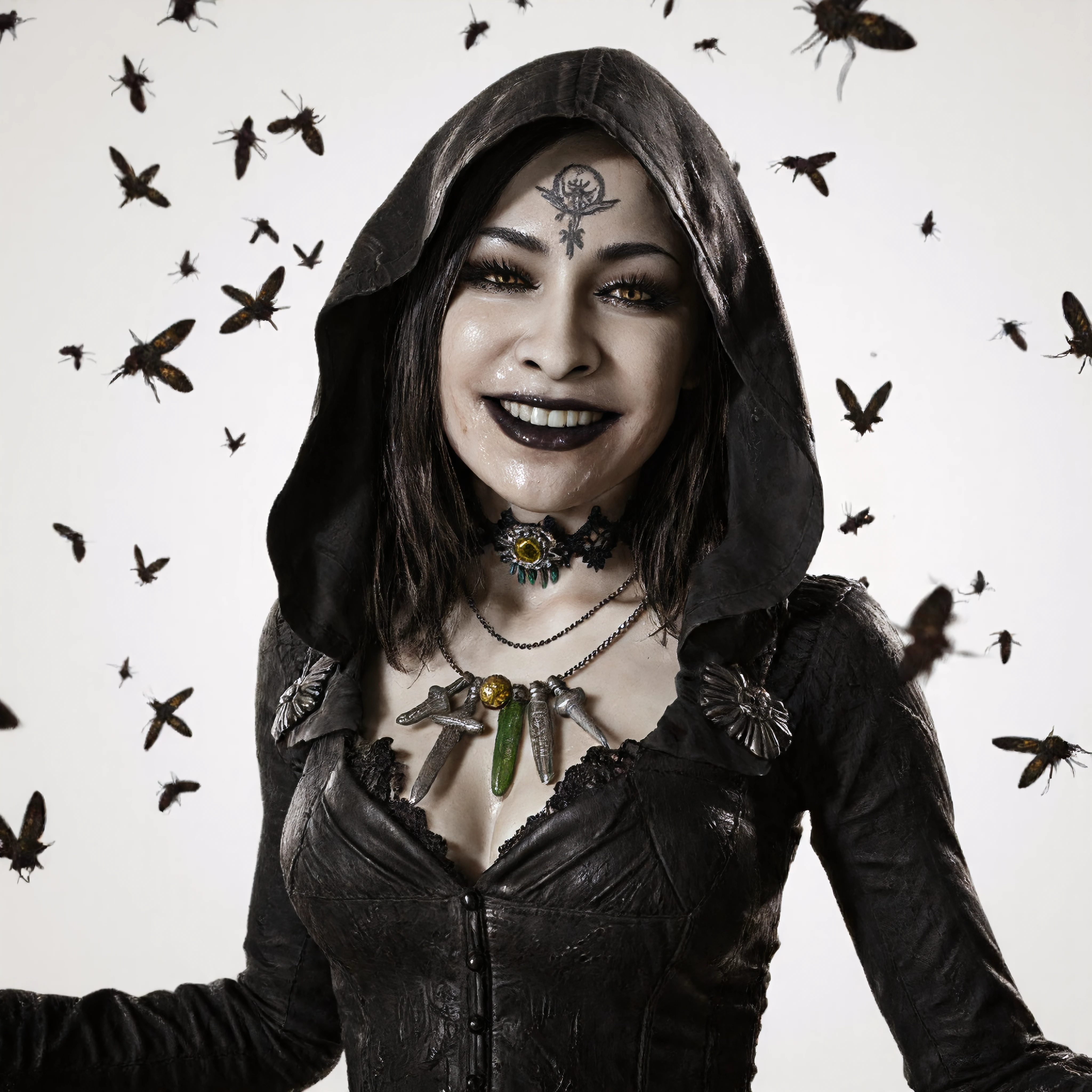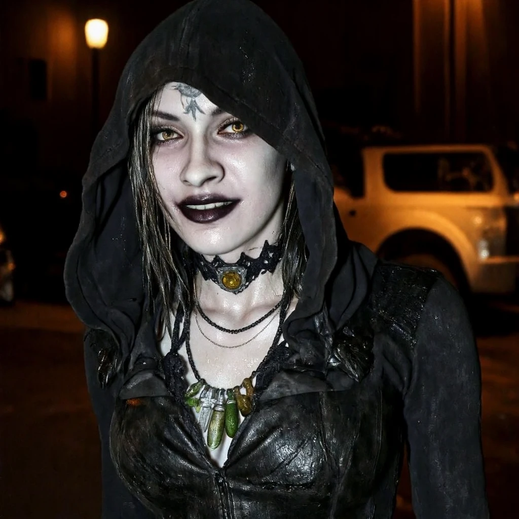 Cassandra Dimitrescu, she has pale grey skin, she has black hair, she has black lips, she has a tattoo on her forehead, she is wearing a choker with a yellow gem, she is wearing a necklace with trinkets, she is wearing a black Gothic dress, she is hooded, evil grin, she has blood on her mouth
