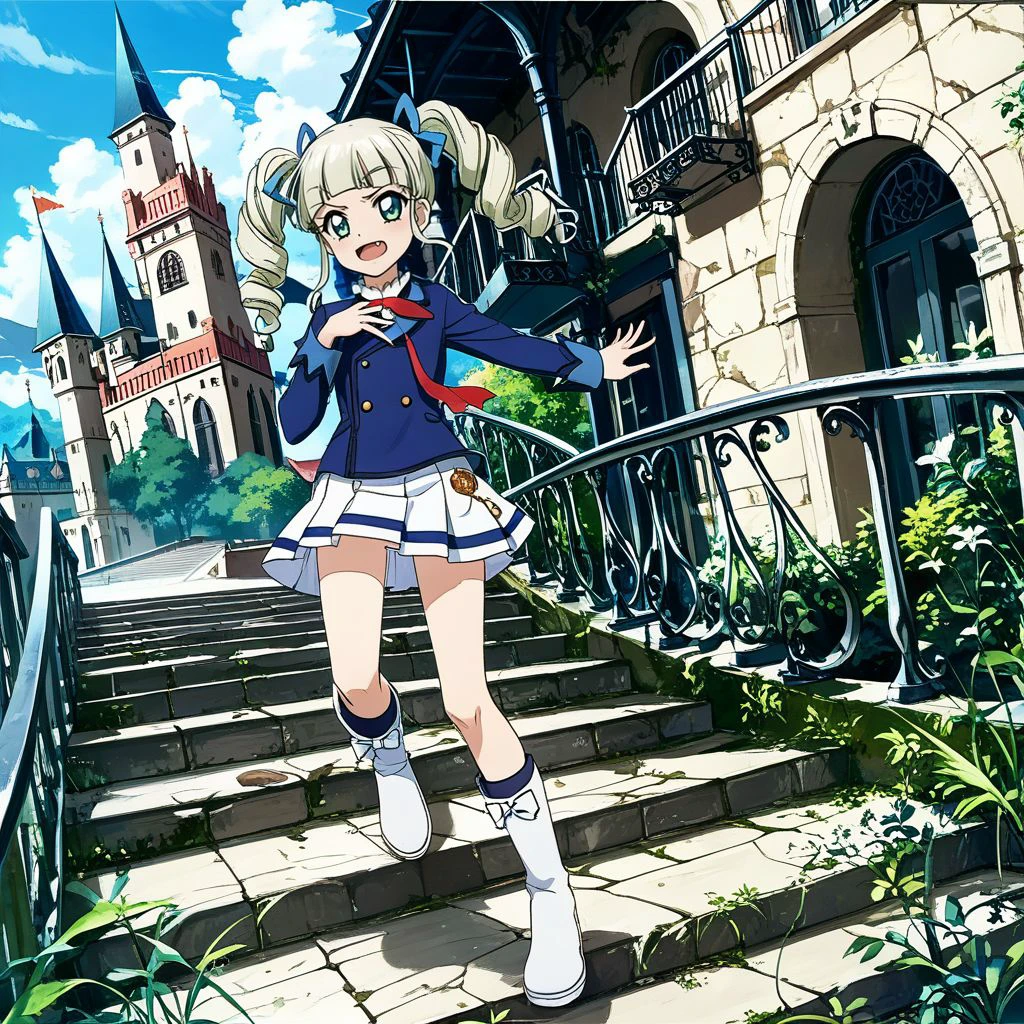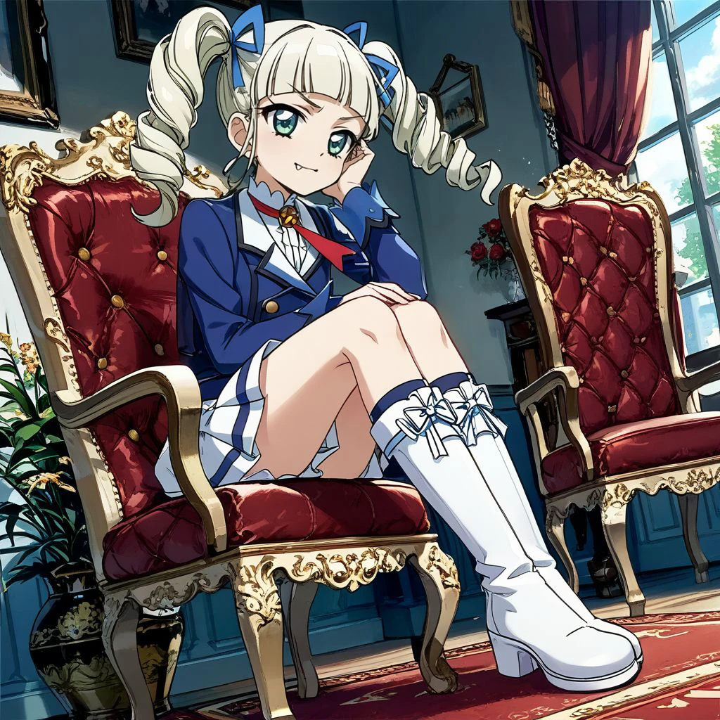trigger: todo yurika, green eyes, platinum blonde hair, blunt bangs, drill hair, twin drills, hair bow, bow,ribbon,fang,fang out, starlight academy school uniform,blue jacket,white skirt white footwear, knee boots