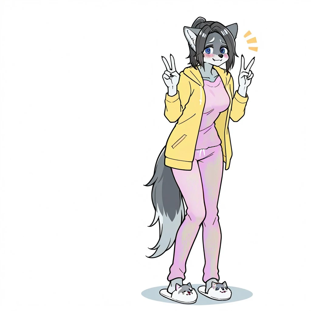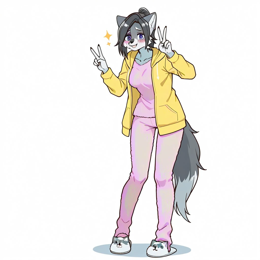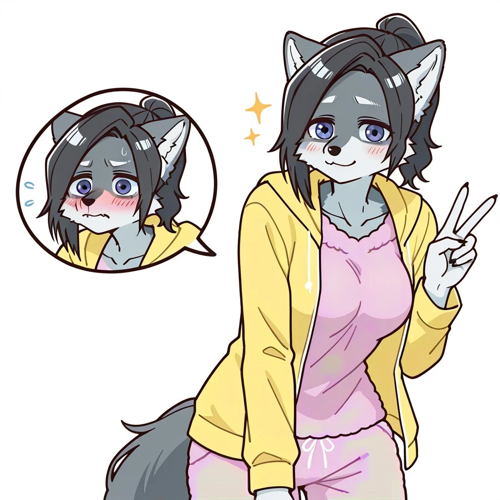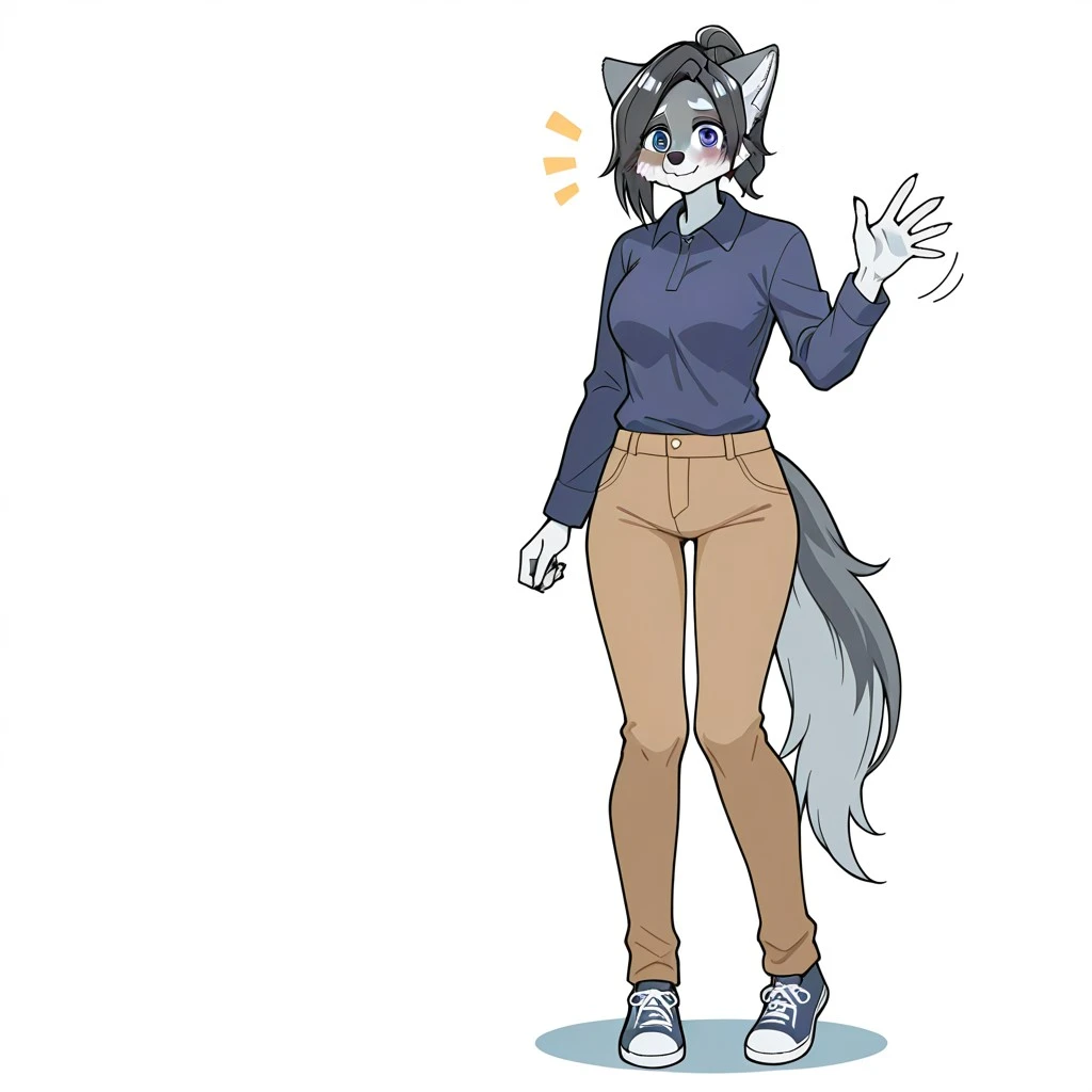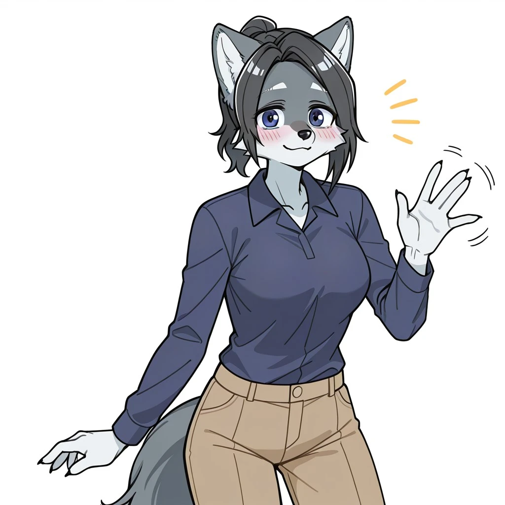 wolf, wolf girl, grey and white fur, black hair, short hair, ponytail, dark blue eyes, black nose, white eyebrows, wolf ears, wolf tail, ,