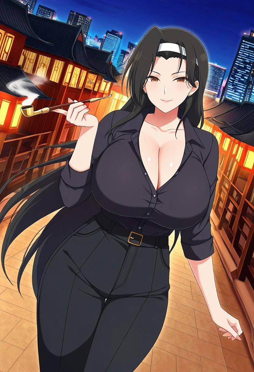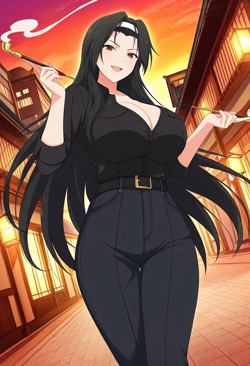 Jasmine, black_hair, long_hair, brown eyes, huge_breasts, hairband, white band,