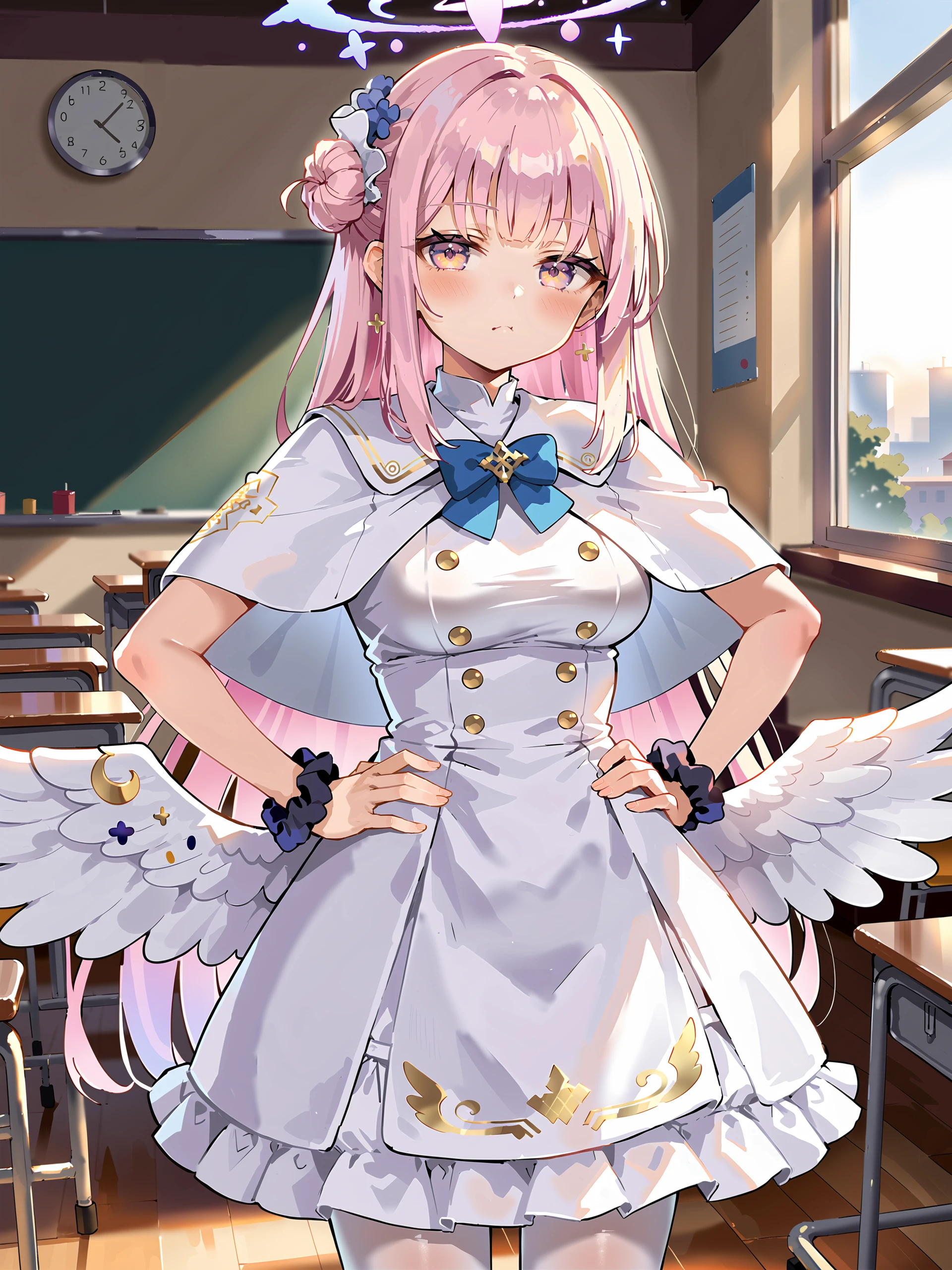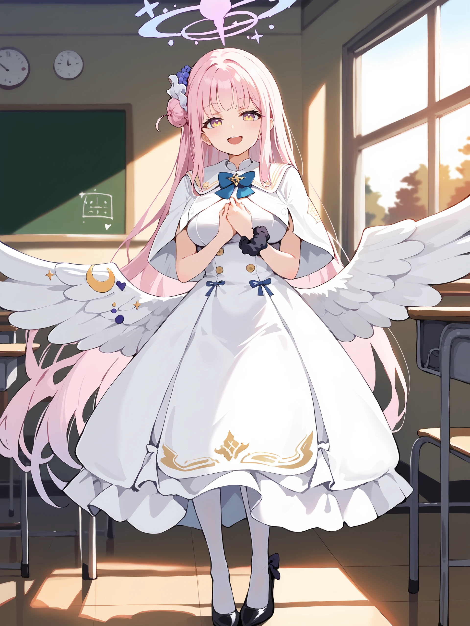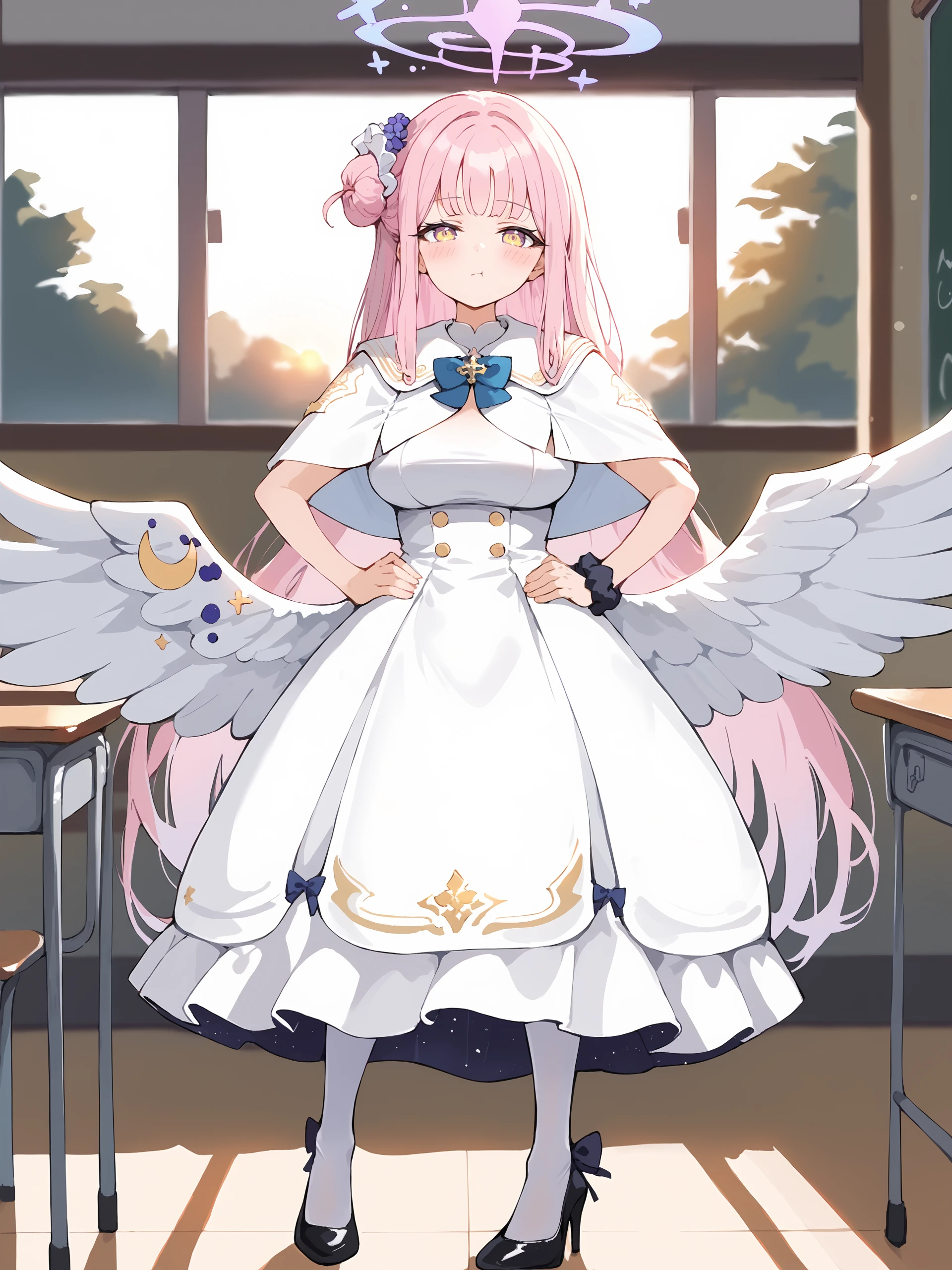 Additional prompts for default costume: wrist scrunchie, low wings, black pumps, hair flower, white dress, single side bun, white pantyhose, capelet, blue bowtie