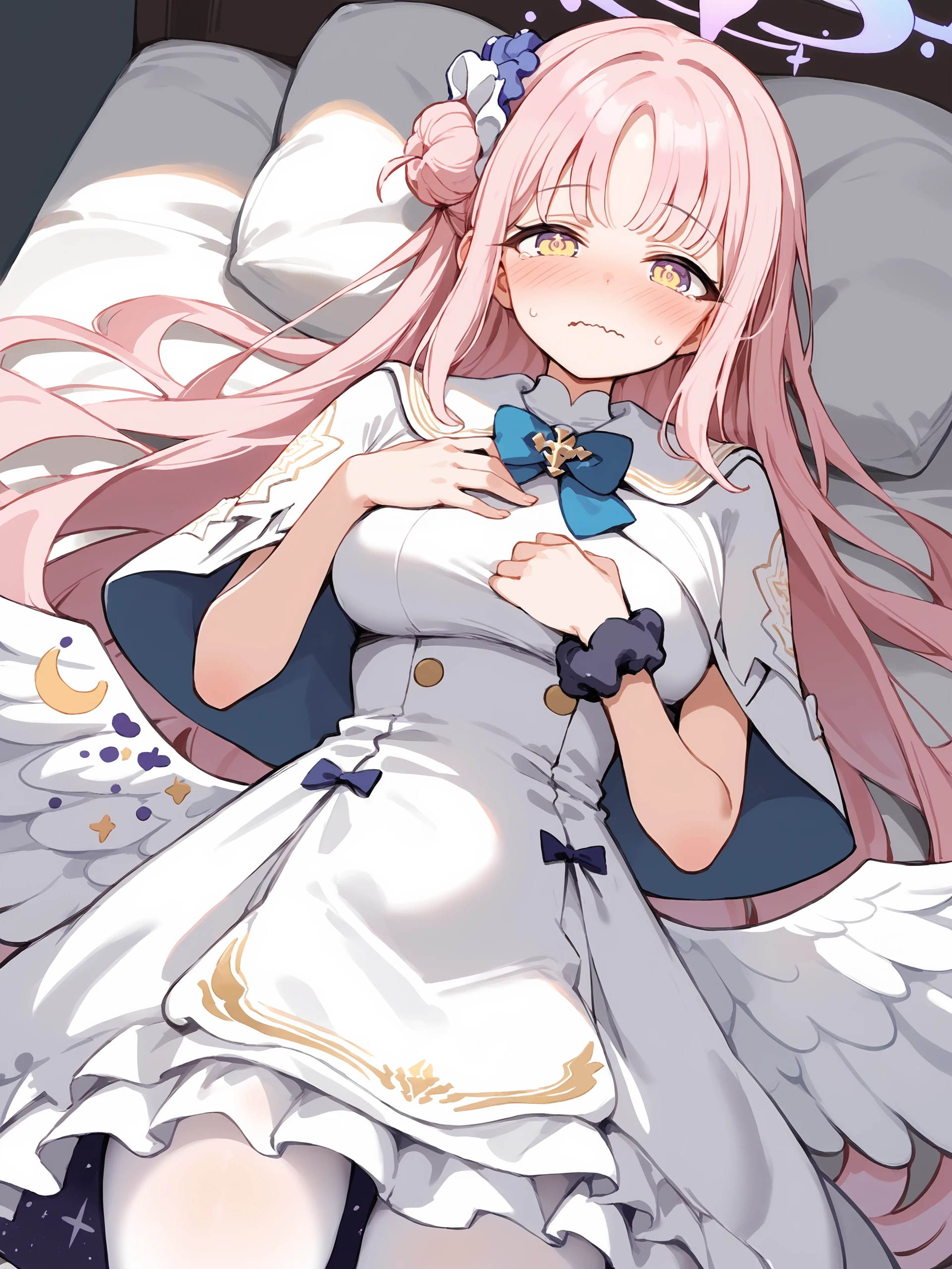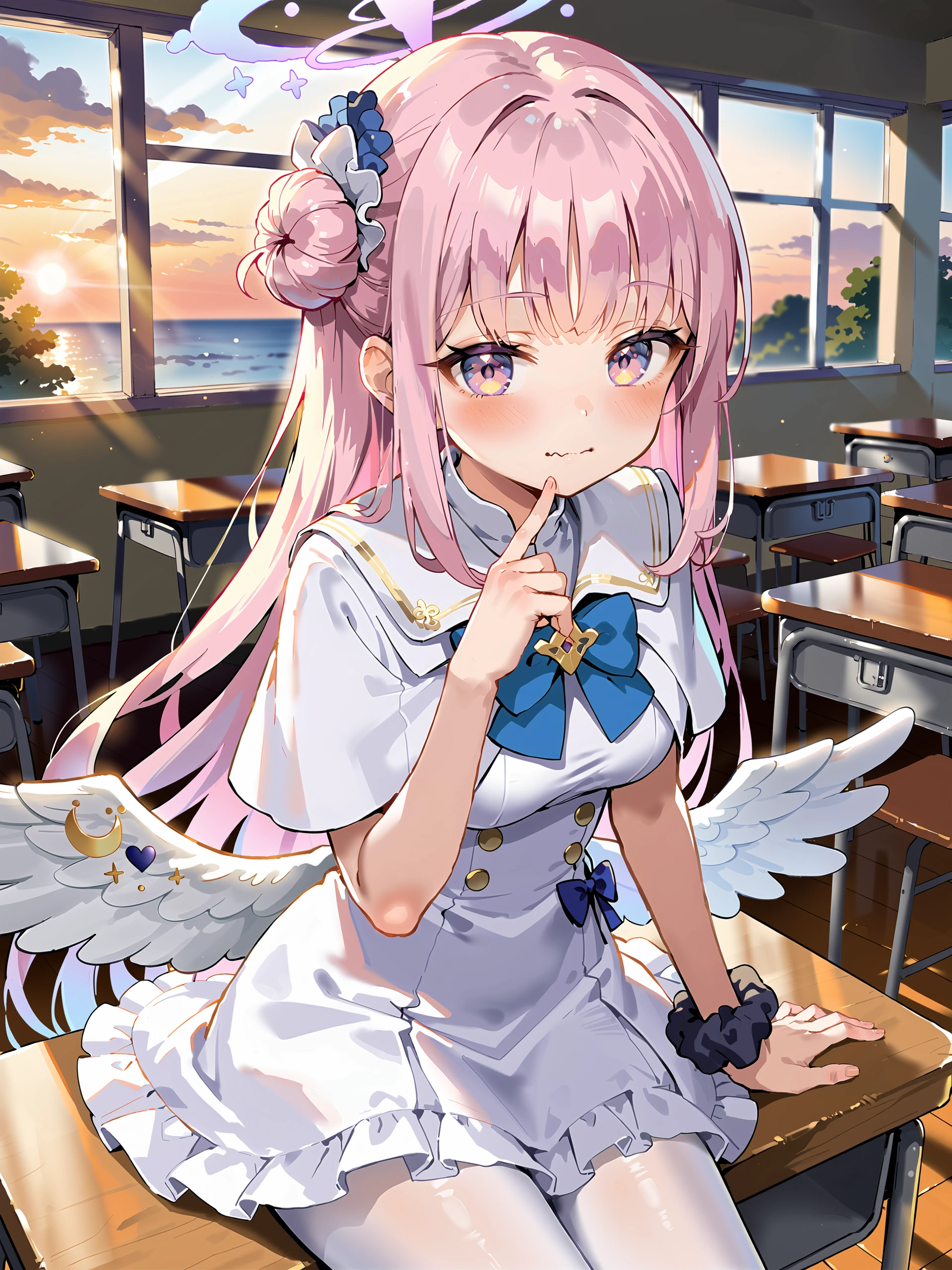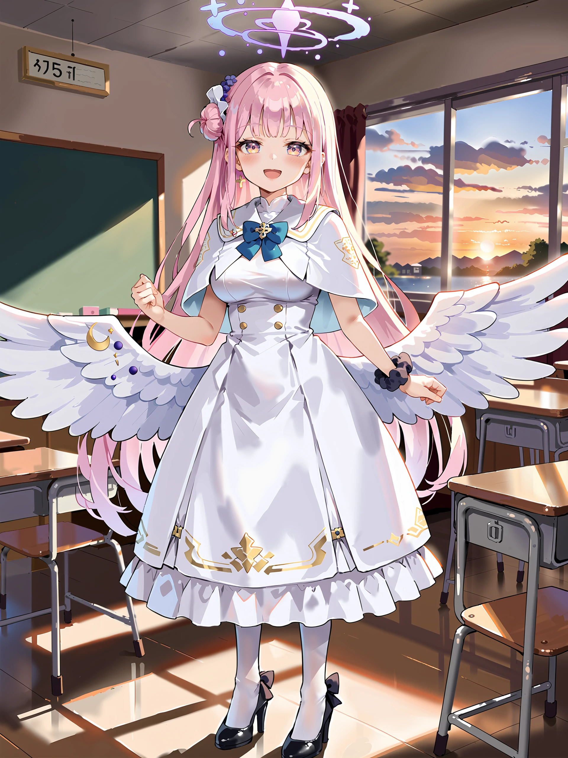 Additional prompts for default costume: wrist scrunchie, low wings, black pumps, hair flower, white dress, single side bun, white pantyhose, capelet, blue bowtie