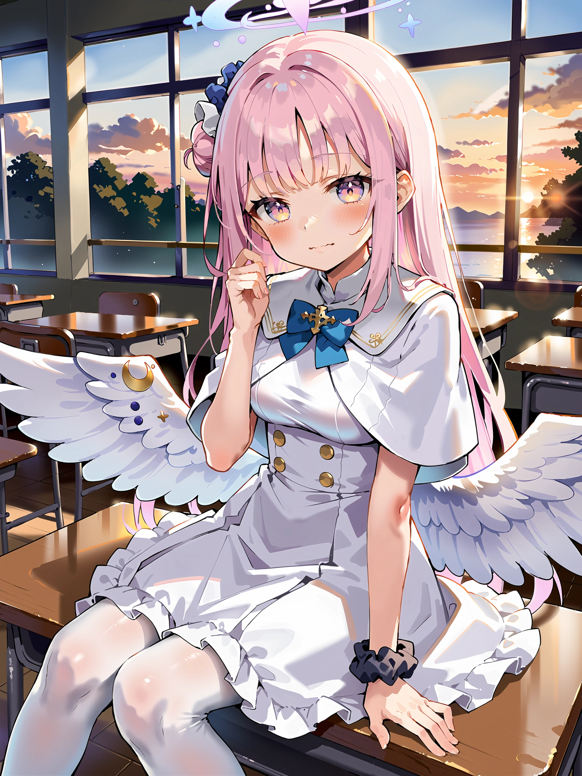 halo, wrist scrunchie, low wings, black pumps, hair flower, white dress, single side bun, white pantyhose, capelet, blue bowtie
