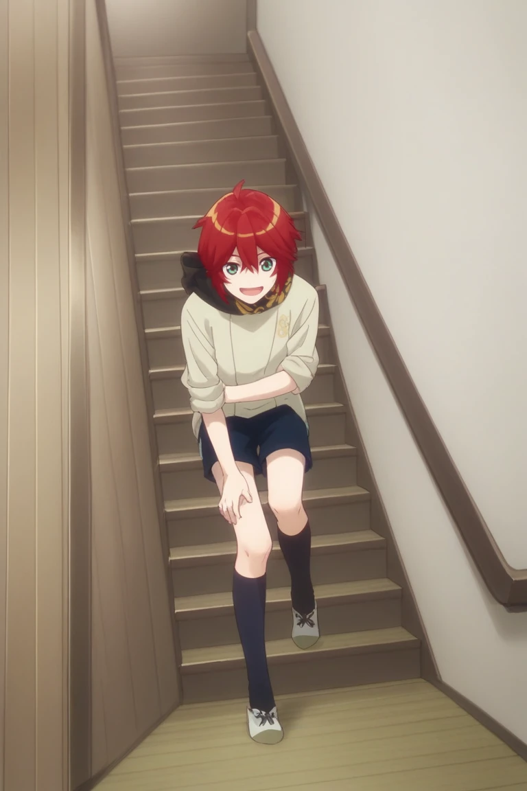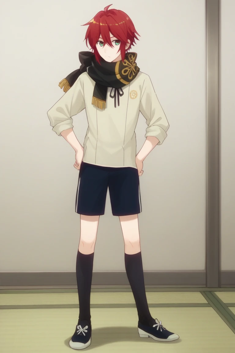 1- black shorts, black socks, kneehighs, black scarf, shoes, beige shirt
