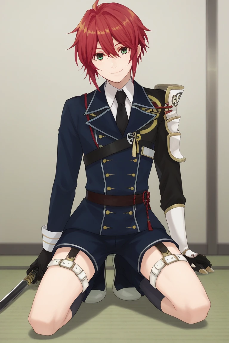2-shoulder armor, necktie, sode, japanese armor, gloves, shorts, military uniform, armor, military, black gloves,