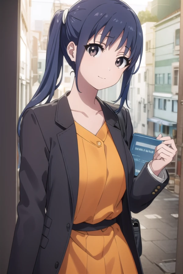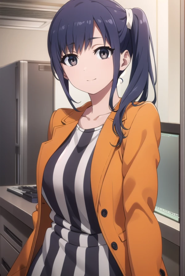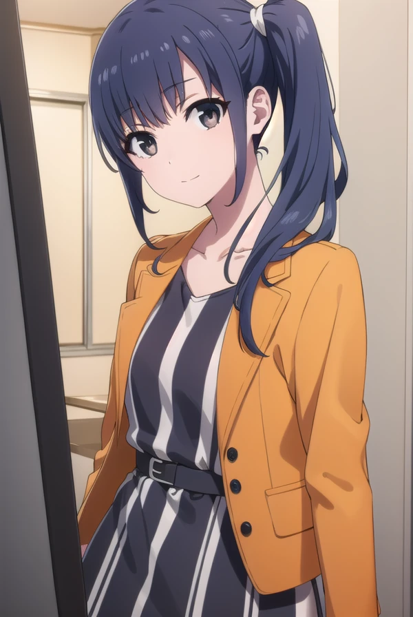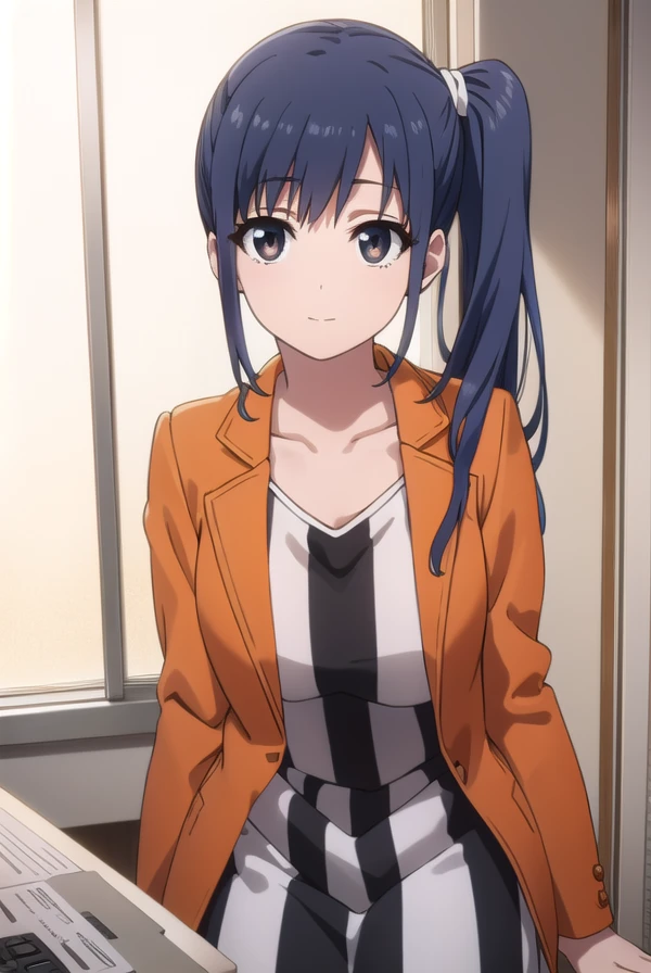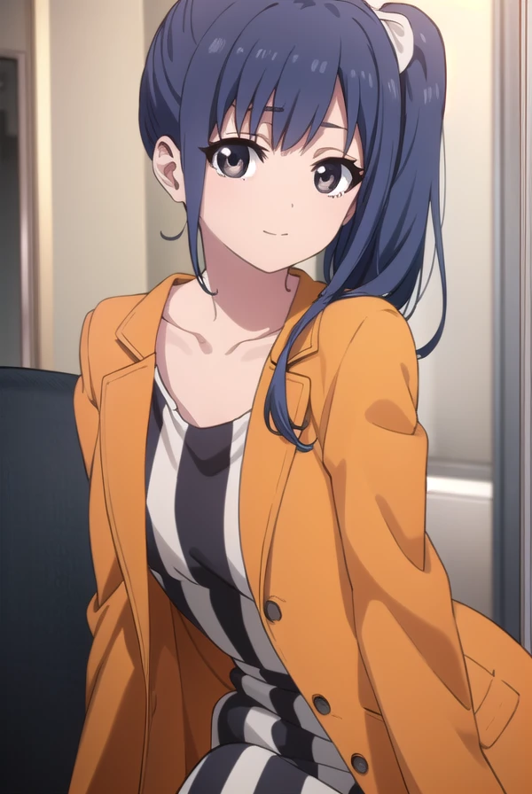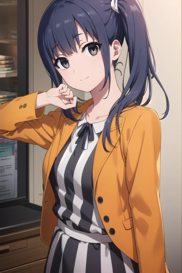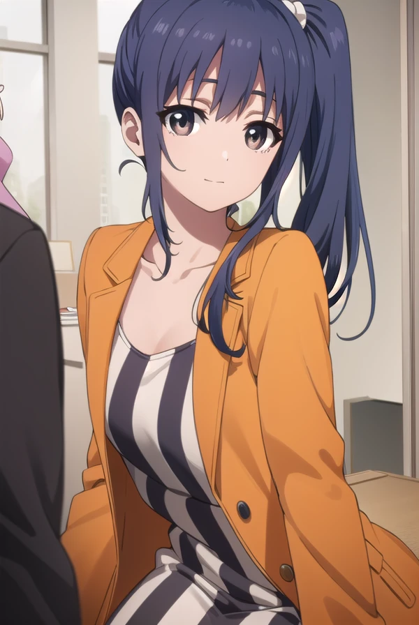 midori imai, long hair, black hair, blue hair, (black eyes:1.3), side ponytail,
