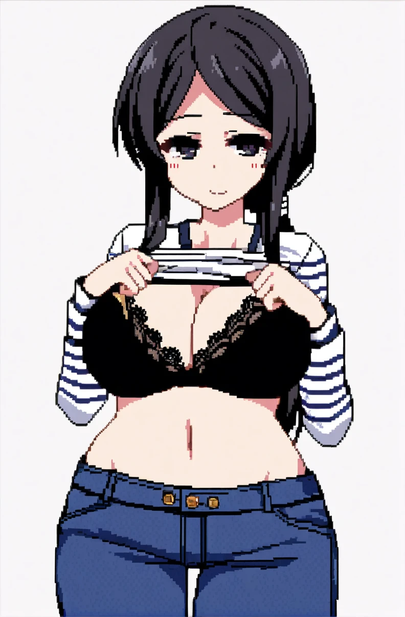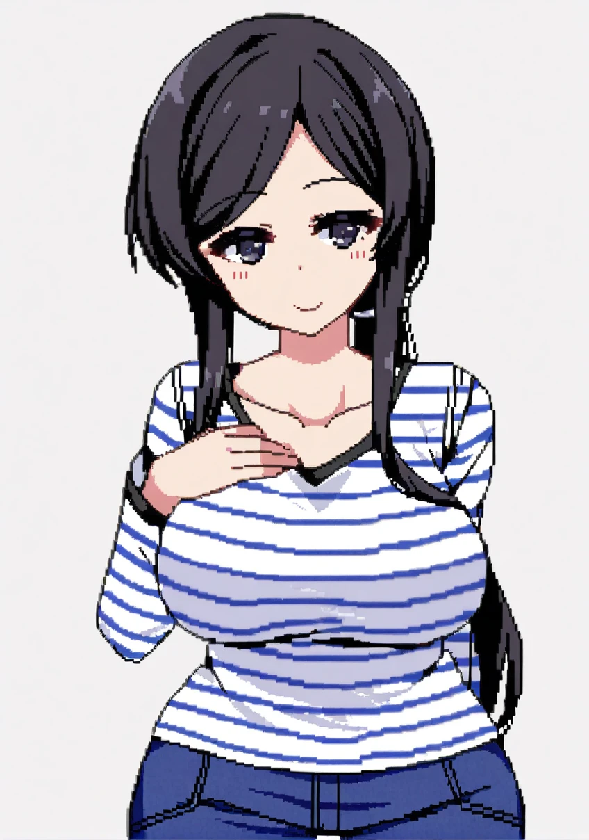 服装触发词:long sleeves,blue jeans, white striped shirt, low ponytail