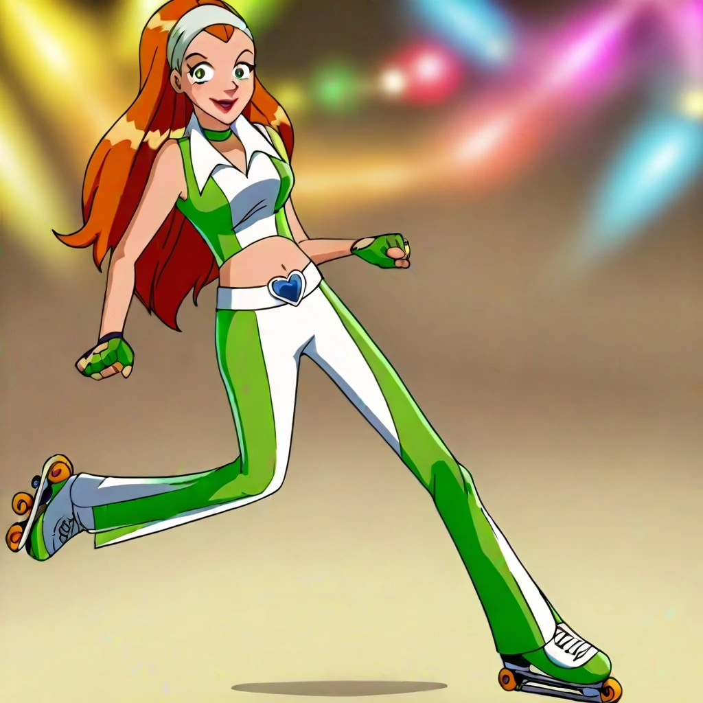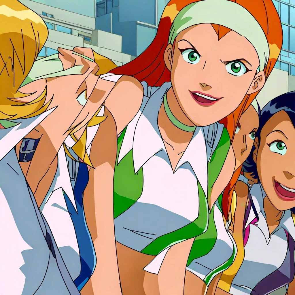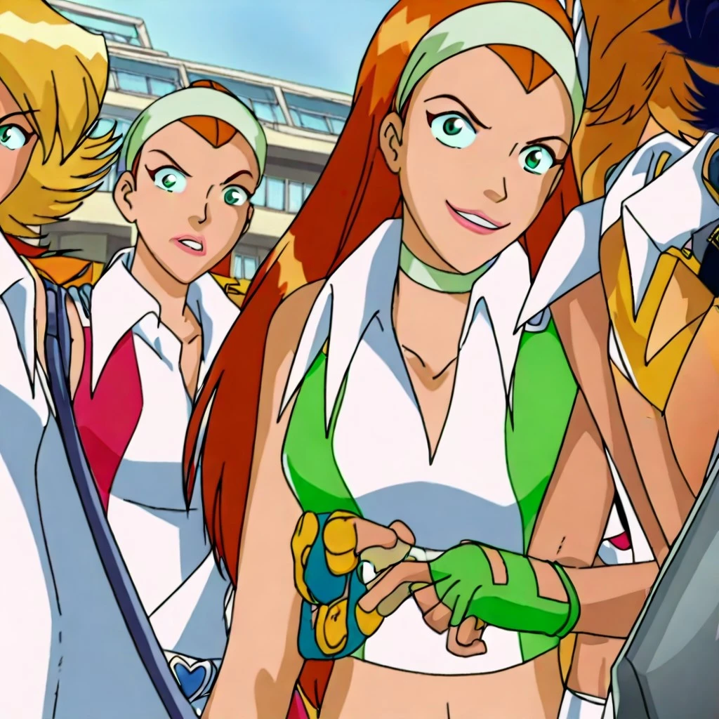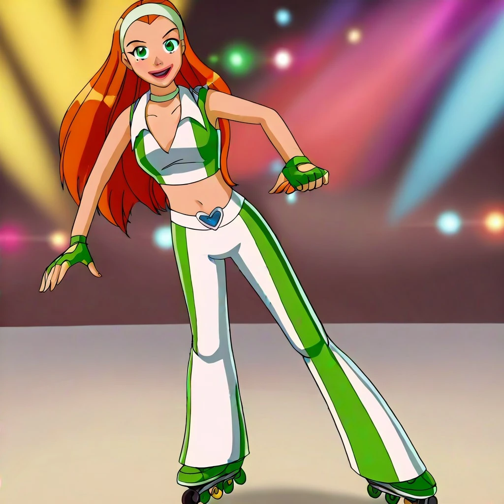 solo, 1girl, Sam, green eyes, orange hair, long hair, lipstick,