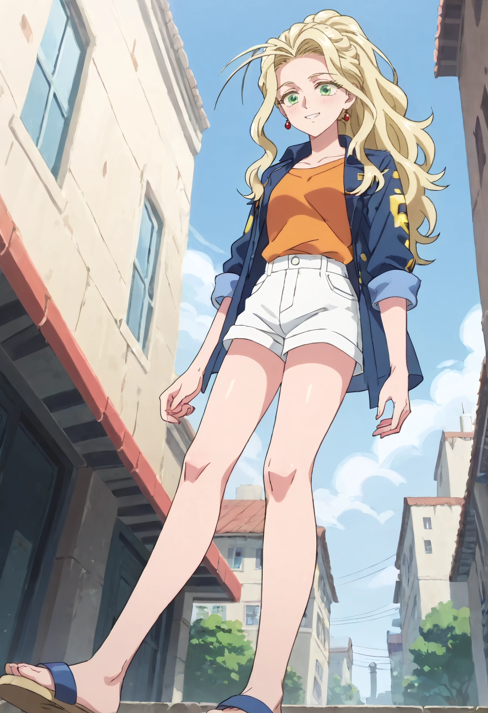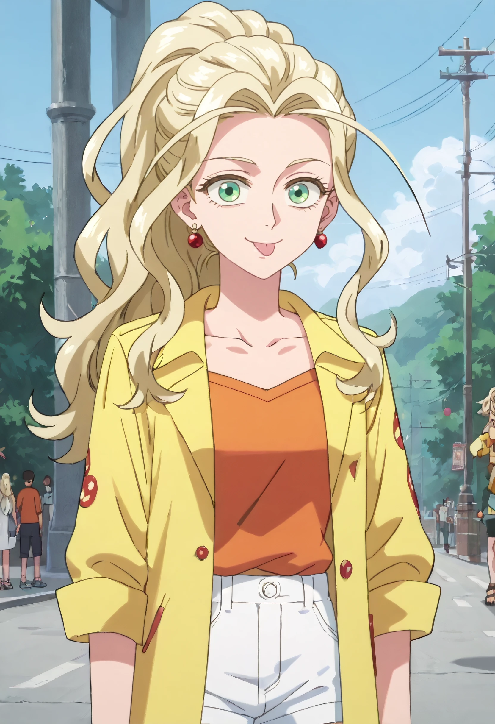 YaomayJacket, shirt, jewelry, earrings, orange shirt, collarbone, shorts, sandals, short shorts, black shirt, sleeves rolled up, jacket, white shorts, collared shirt, open shirt, yellow shirt,