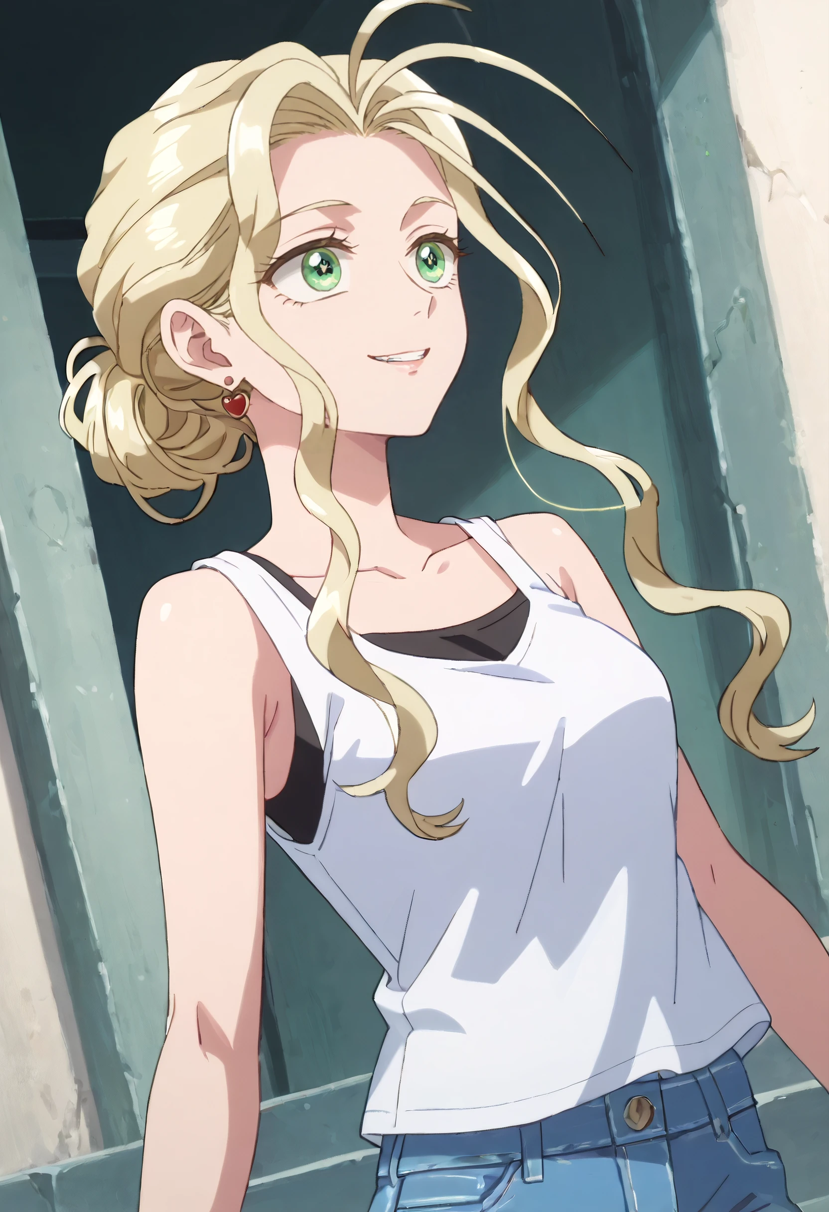 YomayDeShorts, white tank top, sleeveless, hair bun, white shirt, single hair bun, tank top, earrings, jewelry, denim, denim shorts, shorts, short shorts,