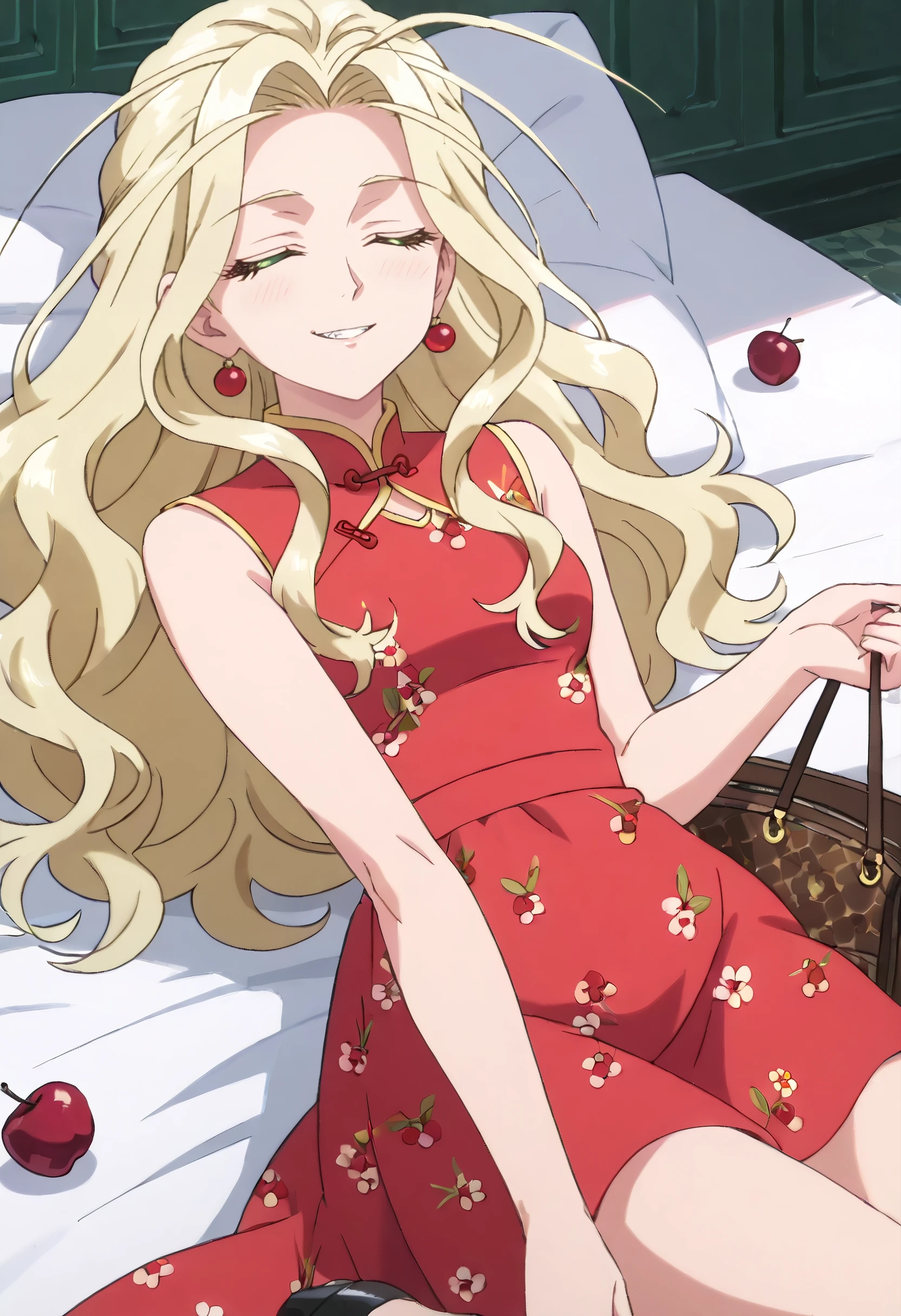 YaomayPiDress, sleeveless, dress, sleeveless dress, bare arms, bare shoulders, parted bangs, pink dress, earrings, jewelry, print dress, cherry, fruit, long dress, black footwear, food print, china dress, plaid clothes,