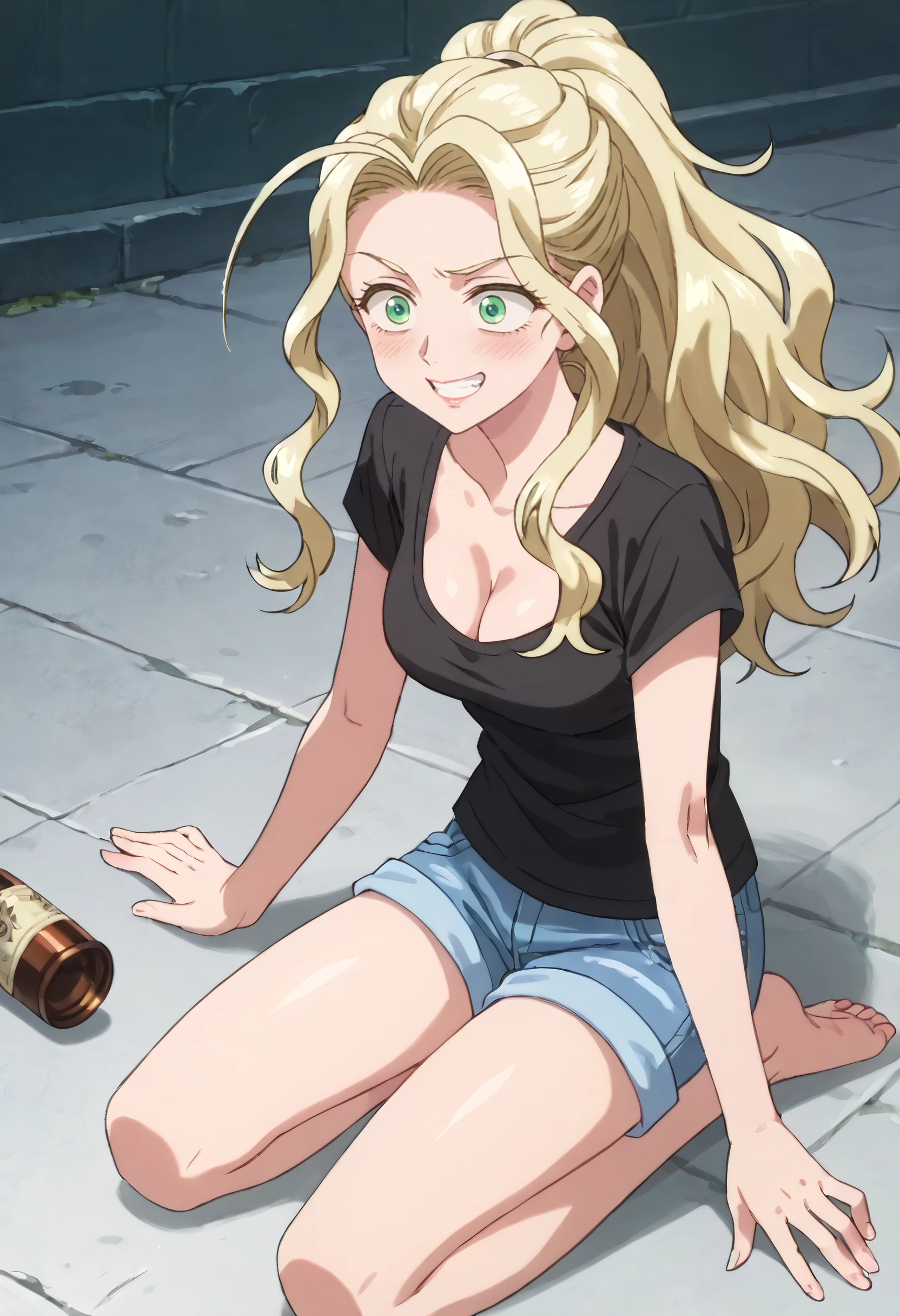YaomayBlShorts, black shirt, shirt, short sleeves, t-shirt, denim, cleavage, casual, denim shorts, shorts, blue shorts,