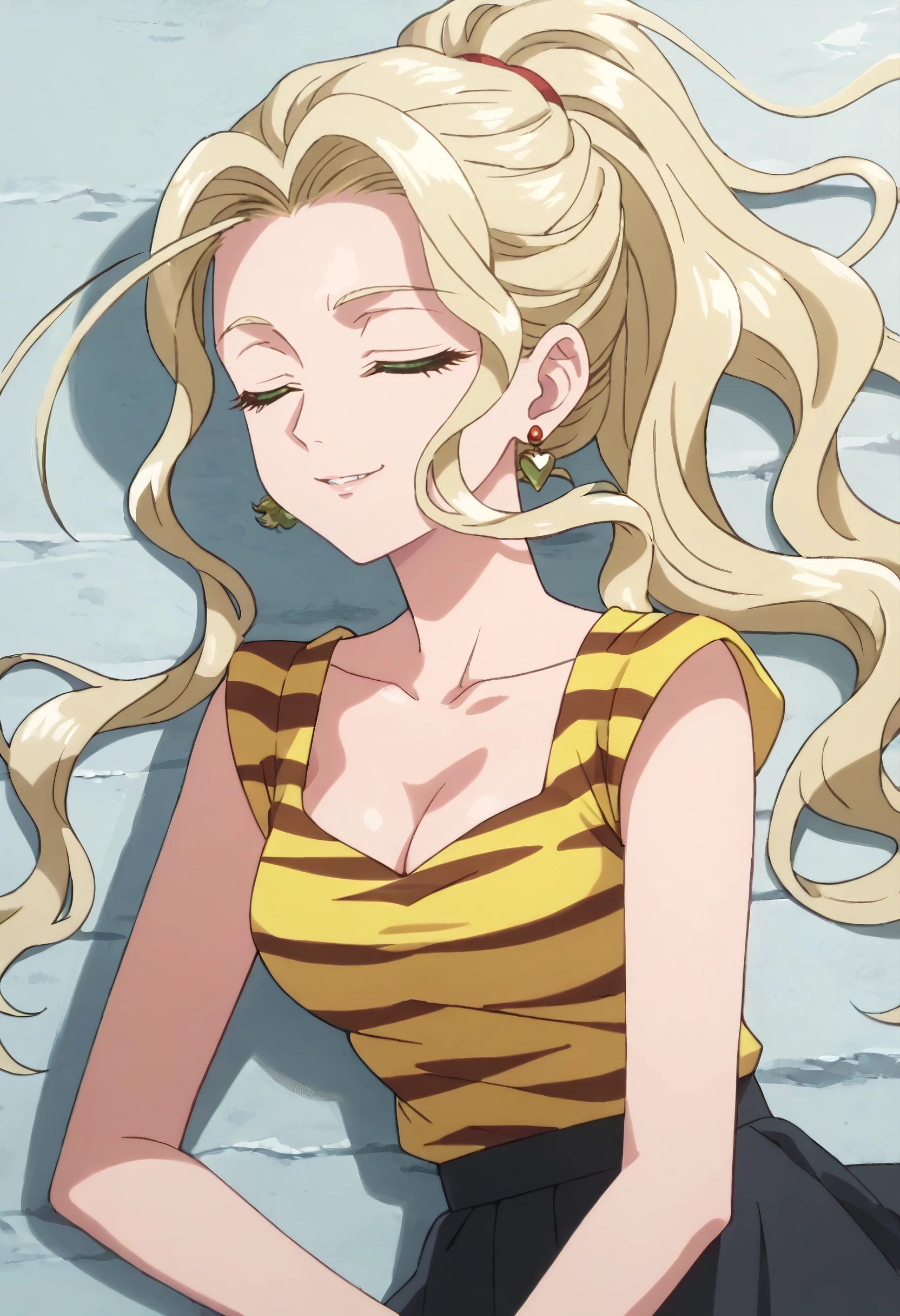 YaomayStShirt, striped clothes, earrings, jewelry, collarbone, shirt, striped shirt, cleavage, short sleeves, sleeveless, yellow shirt, casual, skirt, long skirt, black skirt,