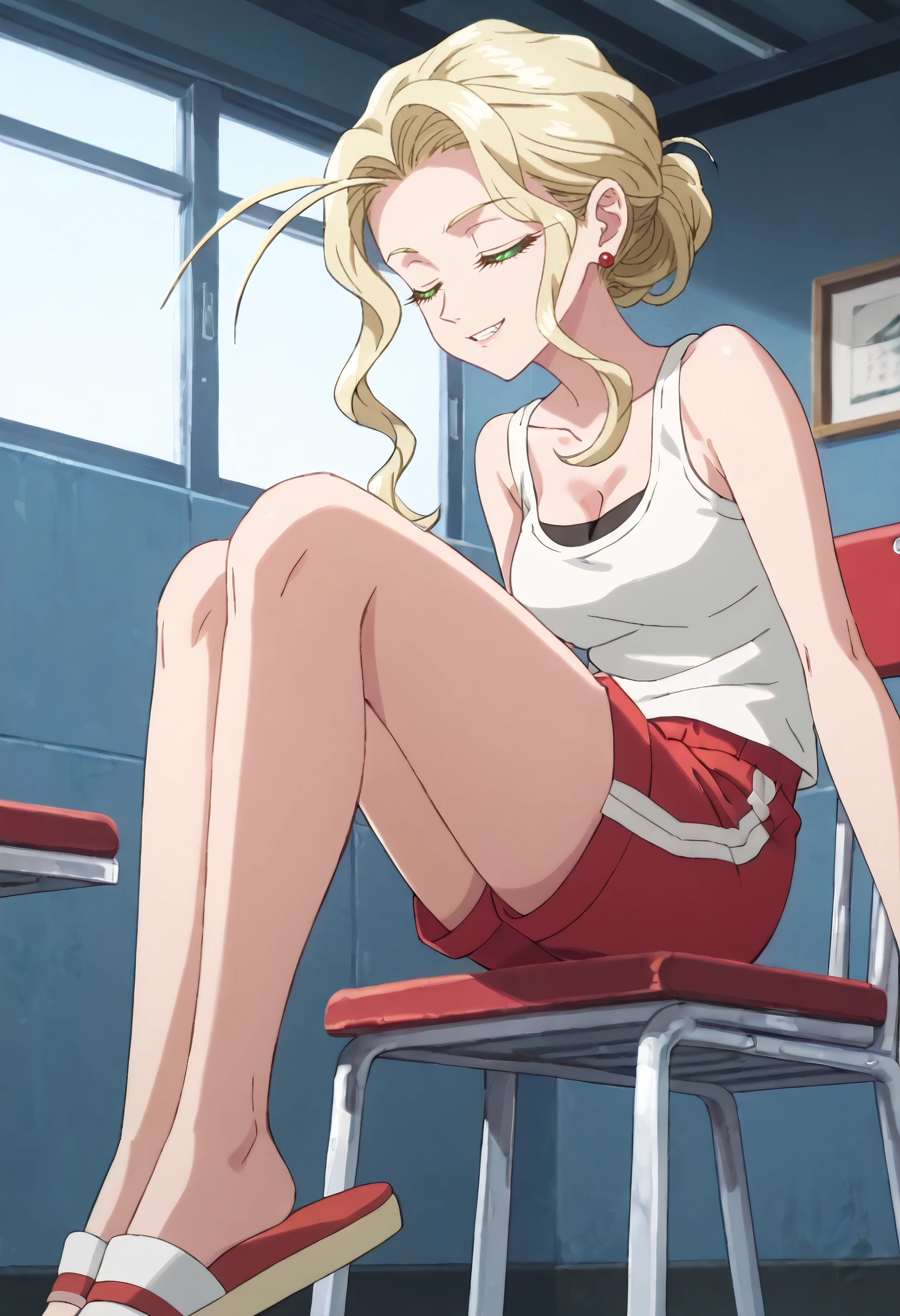 YaomayReShorts, shirt, tank top, hair bun, single hair bun, cleavage, white tank top, sleeveless, shorts, red shorts, short shorts, hair up, jewelry, earrings, gym shorts, slippers,