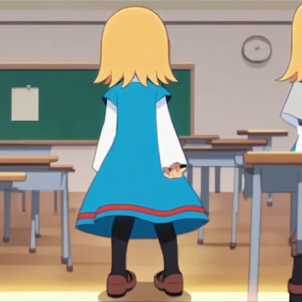Prompt: Mana_GF, Blonde hair, blue eyes, sidelocks, hair ornament, hair clip, fish hair ornament, bangs, blue dress, white turtleneck, turtleneck dress, white sleeves, long sleeves, layered sleeves,, long sleeves under short sleeves, pantyhose, black pantyhose, mary janes, brown footwear,