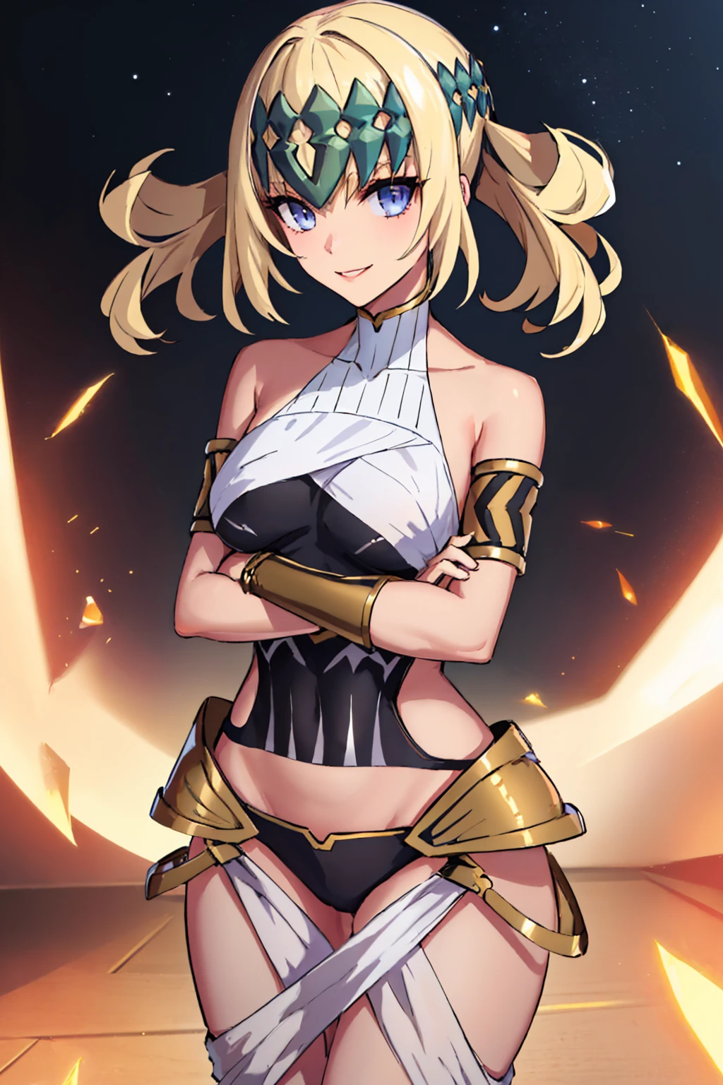 Default Outfit: diadem, halterneck, black shirt, thighs, metal collar, armlet, bracer
