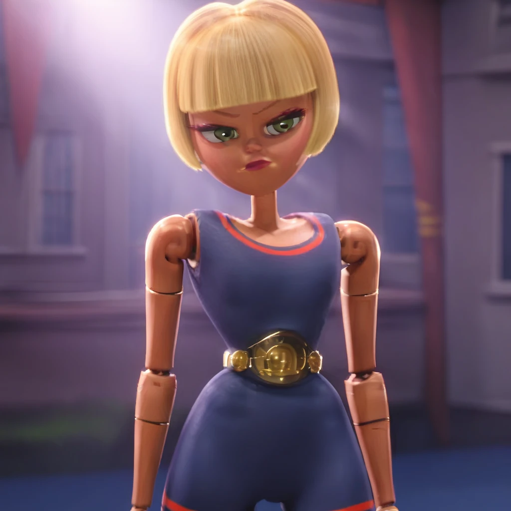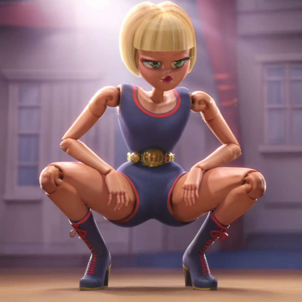 Irene, 1girl, solo, blonde hair, short hair, blunt bangs, bob cut, green eyes, joints, romper,