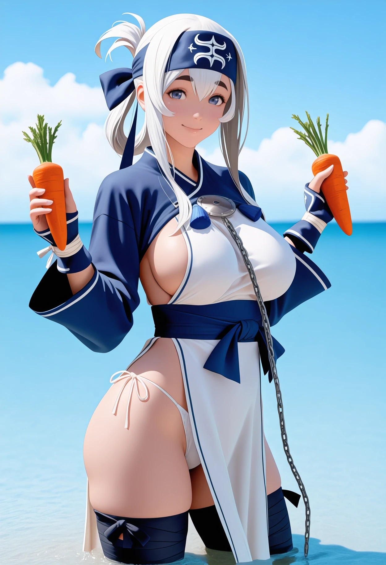 Default Outfit: bandana, blue headband, ainu clothes, cropped jacket, long sleeves, wrist guards, white dress, sleeveless dress, sideboob, blue sash, chain, pelvic curtain, white panties, side-tie panties, black thighhighs