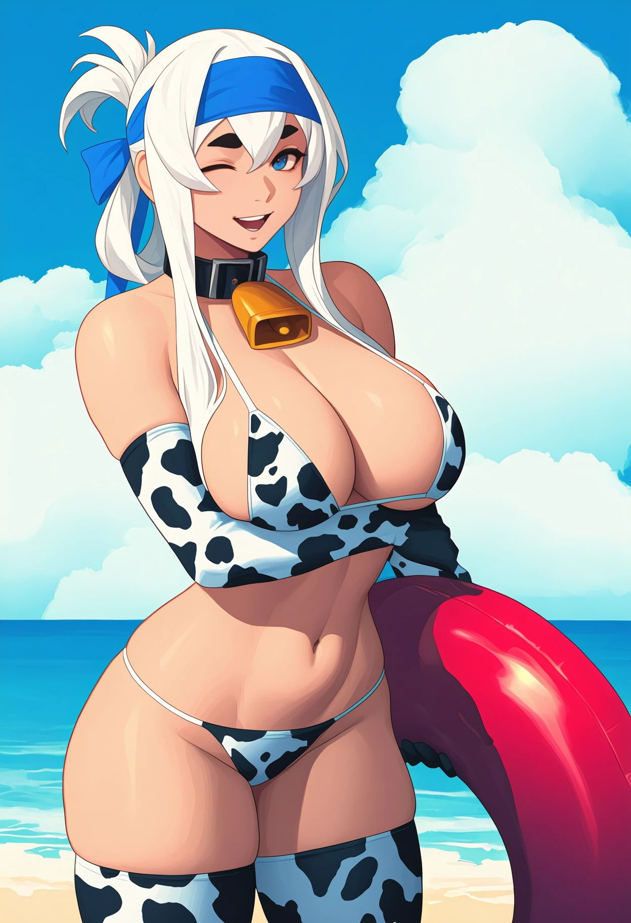 Appearance: long hair, white hair, sidelocks, hair between eyes, folded ponytail, blue eyes, thick eyebrows, large breasts